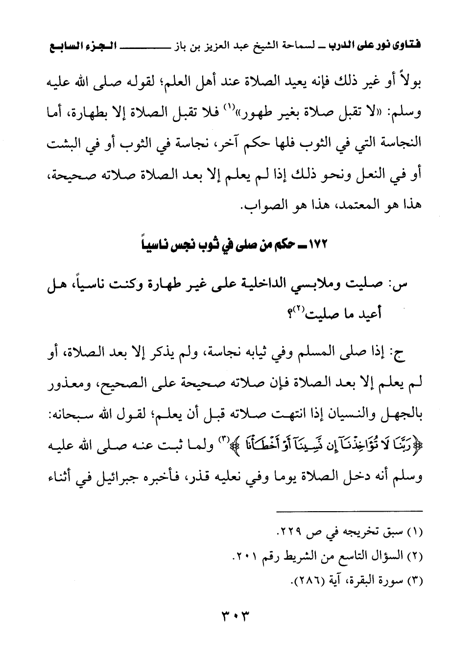 ج: إذا صلى المسلم وفي ثيابه نجاسة، ولم يذكر إلا بعد الصلاة، أو لم يعلم إلا بعد الصلاة فإن صلاته صحيحة على الصحيح، ومعذور بالجهل والنسيان إذا انتهت صلاته قبل أن يعلم؛ لقول الله سبحانه: {رَبَّنَا لَا تُؤَاخِذْنَا إِنْ نَسِينَا أَوْ أَخْطَأْنَا} (¬2) ولما ثبت عنه صلى الله عليه وسلم أنه دخل الصلاة يوما وفي نعليه قذر، فأخبره جبرائيل في أثناء