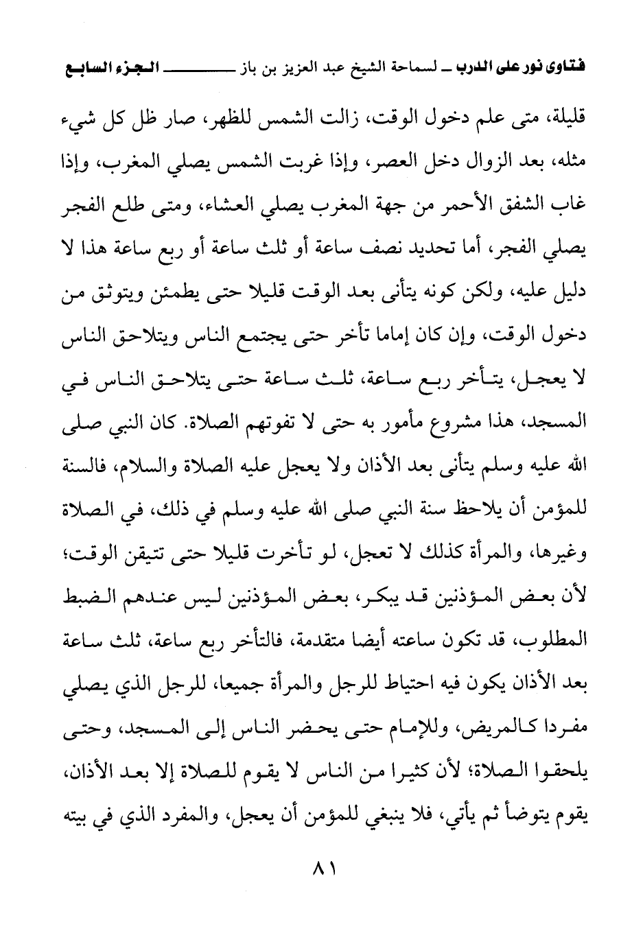 كان النبي - صلى الله عليه وسلم - يتأنى بعد الأذان، ولا يعجل عليه الصلاة والسلام، فالسنة للمؤمن أن يلاحظ سنة النبي - صلى الله عليه وسلم - في ذلك، في الصلاة وغيرها، والمرأة كذلك لا تعجل، لو تأخرت قليلا حتى تتيقن الوقت؛ لأن بعض المؤذنين قد يبكر، بعض المؤذنين ليس عندهم الضبط المطلوب، قد تكون ساعته أيضا متقدمة، فالتأخر ربع ساعة، ثلث ساعة، بعد الأذان يكون فيه احتياط للرجل والمرأة جميعا، للرجل الذي يصلي مفردا كالمريض، وللإمام حتى يحضر الناس إلى المسجد، وحتى يلحقوا الصلاة؛ لأن كثيرا من الناس لا يقوم للصلاة إلا بعد الأذان، يقوم يتوضأ ثم يأتي، فلا ينبغي للمؤمن أن يعجل، والمفرد الذي في بيته