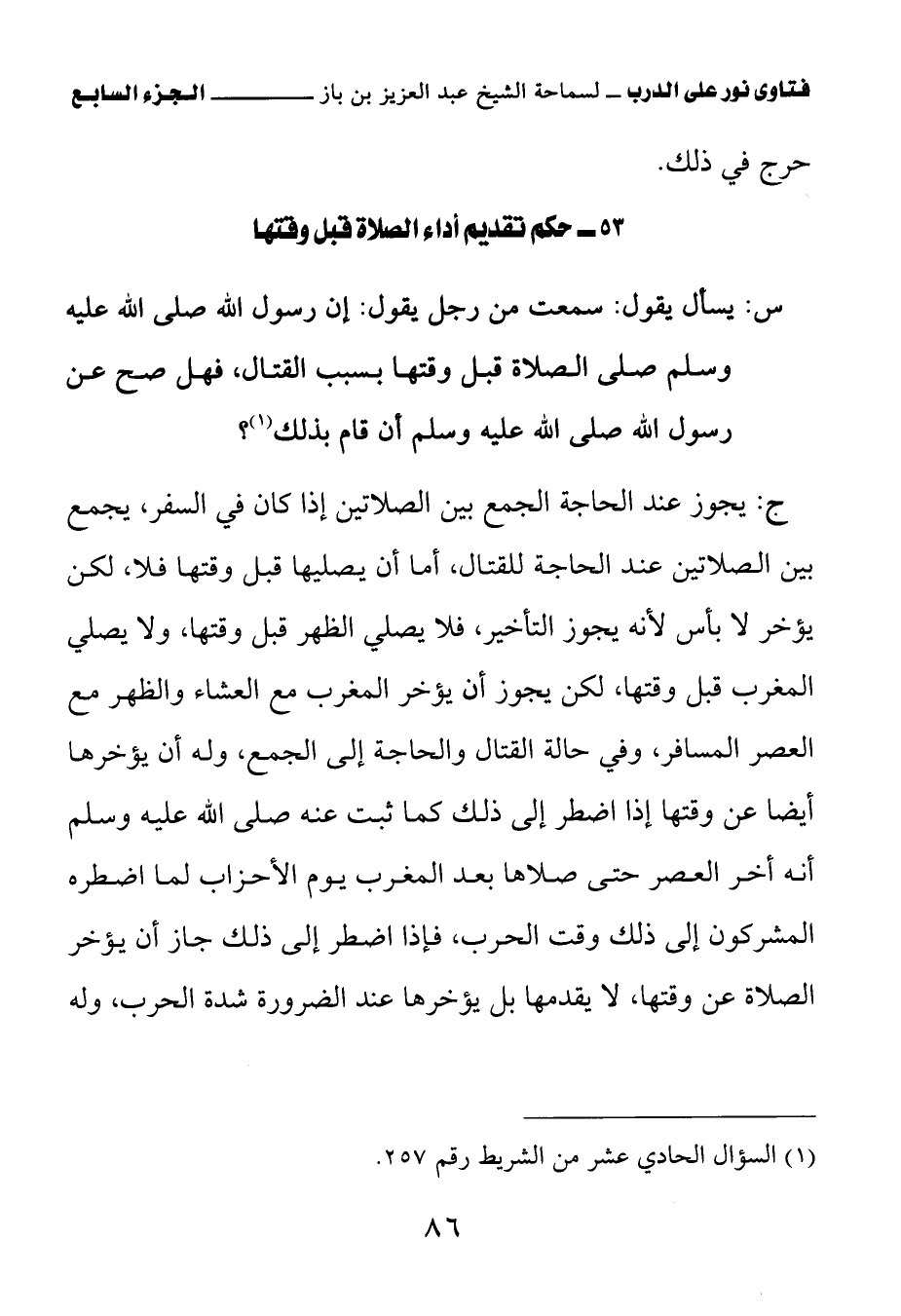 س: يسأل يقول: سمعت من رجل يقول: إن رسول الله - صلى الله عليه وسلم - صلى الصلاة قبل وقتها بسبب القتال، فهل صح عن رسول الله - صلى الله عليه وسلم - أن قام بذلك (¬1)؟