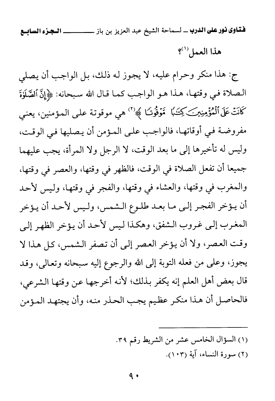 ج: هذا منكر وحرام عليه، لا يجوز له ذلك؛ بل الواجب أن يصلي الصلاة في وقتها، هذا هو الواجب، كما قال الله سبحانه: {إِنَّ الصَّلَاةَ كَانَتْ عَلَى الْمُؤْمِنِينَ كِتَابًا مَوْقُوتًا} (¬2) هي موقوتة على المؤمنين، يعني مفروضة في أوقاتها، فالواجب على المؤمن أن يصليها في الوقت، وليس له تأخيرها إلى ما بعد الوقت، لا الرجل ولا المرأة، يجب عليها جميعا أن تفعل الصلاة في الوقت، فالظهر في وقتها، والعصر في وقتها، والمغرب في وقتها، والعشاء في وقتها، والفجر في وقتها، وليس لأحد أن يؤخر الفجر إلى ما بعد طلوع الشمس، وليس لأحد أن يؤخر المغرب إلى غروب الشفق، وهكذا ليس لأحد أن يؤخر الظهر إلى وقت العصر، ولا أن يؤخر العصر إلى أن تصفر الشمس، كل هذا لا يجوز، وعلى من فعله التوبة إلى الله، والرجوع إليه سبحانه وتعالى، وقد قال بعض أهل العلم: إنه يكفر بذلك؛ لأنه أخرجها عن وقتها الشرعي.