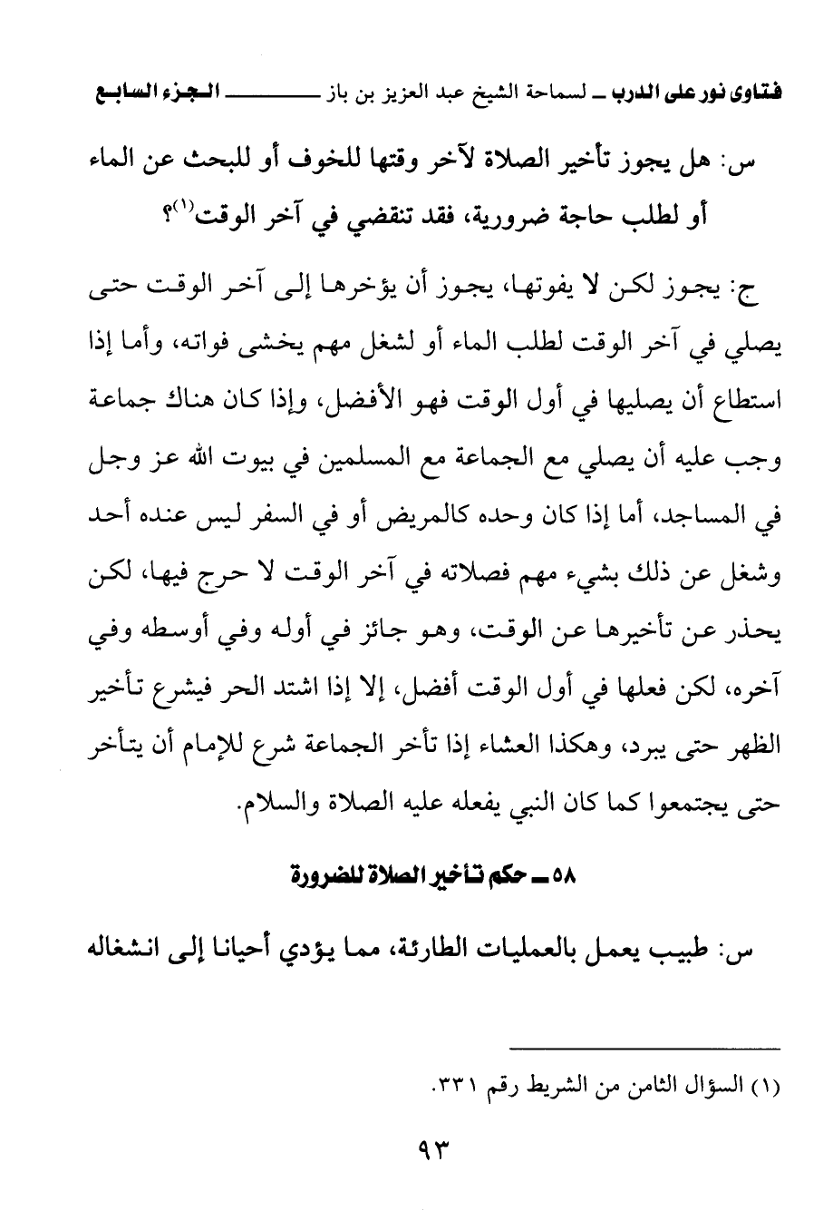 ج: يجوز، لكن لا يفوتها، يجوز أن يؤخرها إلى آخر الوقت حتى يصلي في آخر الوقت لطلب الماء، أو لشغل مهم يخشى فواته، وأما إذا استطاع أن يصليها في أول الوقت فهو الأفضل، وإذا كان هناك جماعة وجب عليه أن يصلي مع الجماعة مع المسلمين في بيوت الله عز وجل في المساجد، أما إذا كان وحده كالمريض أو في السفر ليس عنده أحد، وشغل عن ذلك بشيء مهم فصلاته في آخر الوقت لا حرج فيها، لكن يحذر عن تأخيرها عن الوقت، وهو جائز في أوله وفي أوسطه وفي آخره، لكن فعلها في أول الوقت أفضل، إلا إذا اشتد الحر فيشرع تأخير الظهر حتى يبرد، وهكذا العشاء إذا تأخر الجماعة شرع للإمام أن يتأخر حتى يجتمعوا، كما كان النبي يفعله عليه الصلاة والسلام.