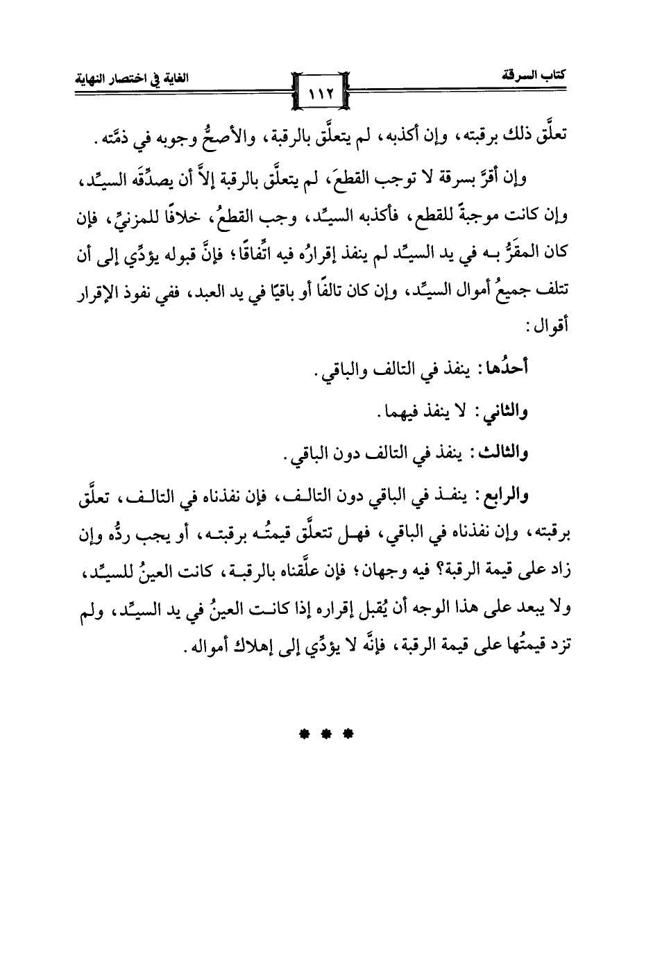 وإن أقرَّ بسرقة لا توجب القطعَ، لم يتعلَّق بالرقبة إلَّا أن يصدّقَه السيِّد، وإن كانت موجبةً للقطع، فأكذبه السيد، وجب القطعُ، خلافًا للمزنيِّ، فإن كان المقَرُّ به في يد السيِّد لم ينفذ إقرارُه فيه اتِّفاقًا؛ فمانَّ قبوله يؤدي إلى أن تتلف جميعُ أموال السيِّد، وإن كان تالفًا أو باقيًا في يد العبد، ففي نفوذ الإقرار أقوال: