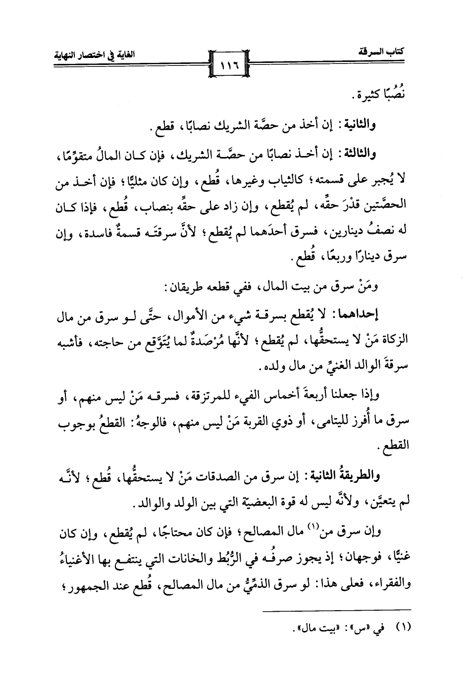 والثالثة: إن أخذ نصابًا من حصَّة الشريك، فإن كان المالُ متقوِّمًا، لا يُجبر على قسمته؛ كالثياب وغيرها، قُطع، وإن كان مثليًّا؛ فإن أخذ من الحصَّتين قدْرَ حقِّه، لم يُقطع، وإن زاد على حقِّه بنصاب، قُطع، فإذا كان له نصفُ دينارين، فسرق أحدَهما لم يُقطع؛ لأنَّ سرقتَه قسمةٌ فاسدة، وإن سرق دينارًا وربعًا، قُطع.