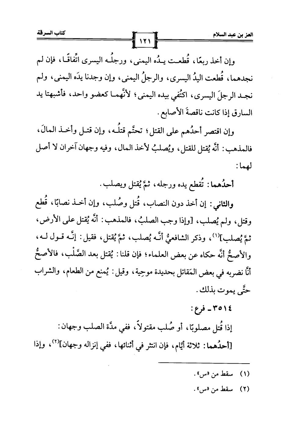 أحدُهما؛ تُقطع يده ورجله، ثمَّ يُقتل ويصلب.