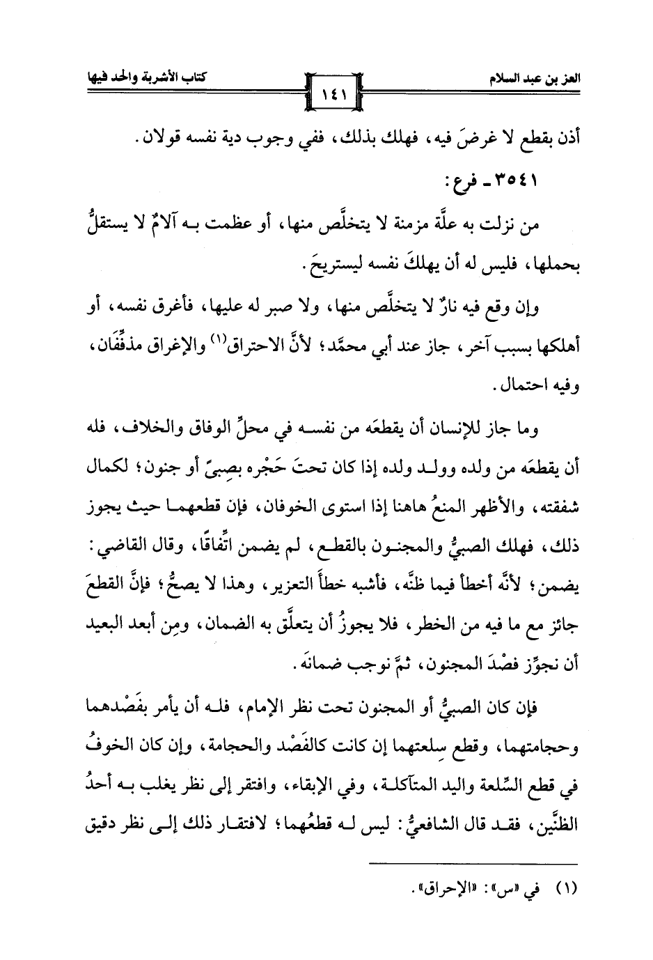 وما جاز للإنسان أن يقطعَه من نفسه في محلِّ الوفاق والخلاف، فله أن يقطعَه من ولده وولد ولده إذا كان تحتَ حَجْره بصِبىً أو جنون؛ لكمال شفقته، والأظهر المنعُ ها هنا إذا استوى الخوفان، فإن قطعهما حيث يجوز ذلك، فهلك الصبيُّ والمجنون بالقطع، لم يضمن اتِّفاقًا، وقال القاضي: يضمن؛ لأنه أخطأ فيما ظنَّه، فأشبه خطأَ التعزير، وهذا لا يصحُّ؛ فإنَّ القطعَ جائز مع ما فيه من الخطر، فلا يجوزُ أن يتعلَّق به الضمان، ومِن أبعد البعيد أن نجوِّز فصْدَ المجنون، ثمَّ نوجب ضمانَه.
