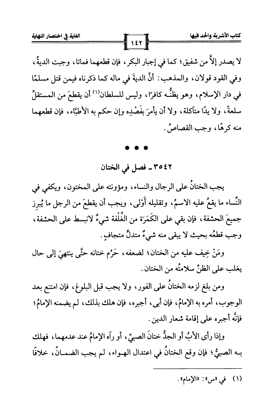 لا يصدر إلَّا من شفيق؛ كما في إجبار البكر، فإن قطعهما فماتا، وجبت الديةُ، وفي القود قولان، والمذهب؛ أنَّ الديةَ في ماله كما ذكرناه فيمن قتل مسلمًا في دار الإِسلام، وهو يظنُّه كافرًا, وليس للسلطان (¬1) أن يقطعَ من المستقلِّ سلعةً، ولا يدًا متآكلة، ولا أن يأمرَ بفَصْدِه وإن حكم به الأطبَّاء، فإن قطعهما منه كرهًا، وجب القصاصُ.