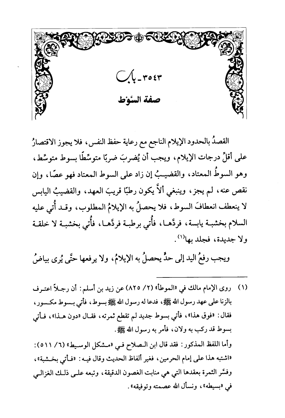 (¬1) روى الإِمام مالك في "الموطأ" (2/ 825) عن زيد بن أسلم: أن رجلًا اعترف بالزنا على عهد رسول الله - صلى الله عليه وسلم -، فدعا له رسول الله - صلى الله عليه وسلم - بسوط، فأتي بسوط مكسور، فقال: "فوق هذا"، فأتي بسوط جديد لم تقطع ثمرته، فقال "دون هذا"، فأتي بسوط قد ركب به ولان، فأمر به رسول الله - صلى الله عليه وسلم -.