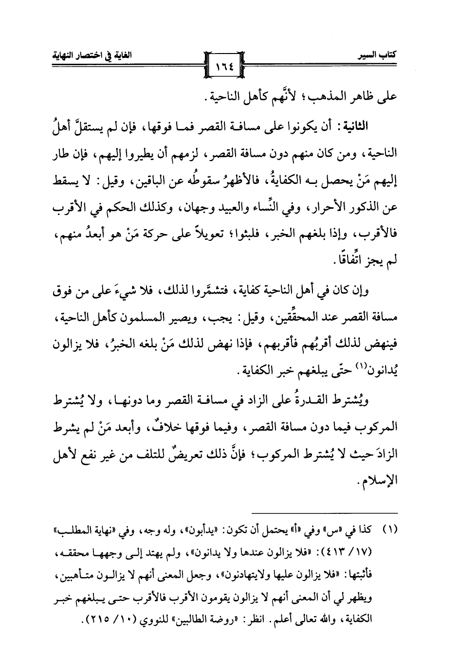 الثانية: أن يكونوا على مسافة القصر فما فوقها، فإن لم يستقلَّ أهلُ الناحية، ومن كان منهم دون مسافة القصر، لزمهم أن يطيروا إليهم، فإن طار إليهم مَنْ يحصل به الكفايةُ، فالأظهرُ سقوطُه عن الباقين، وقيل: لا يسقط عن الذكور الأحرار، وفي النِّساء والعبيد وجهان، وكذلك الحكم في الأقرب فالأقرب، وإذا بلغهم الخبر، فلبثوا؛ تعويلًا على حركة مَنْ هو أبعدُ منهم، لم يجز اتِّفاقًا.