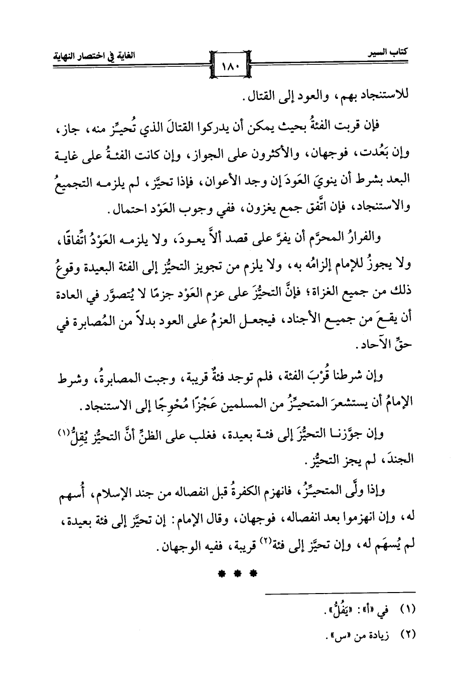 فإن قربت الفئةُ بحيث يمكن أن يدركوا القتالَ الذي تُحيِّز منه، جاز، وإن بَعُدت، فوجهان، والأكثرون على الجواز، وإن كانت الفئةُ على غاية البعد بشرط أن ينويَ العَودَ إن وجد الأعوان، فإذا تحيَّز، لم يلزمه التجميعُ والاستنجاد، فإن اتَّفق جمع يغزون، ففي وجوب العَوْد احتمال.