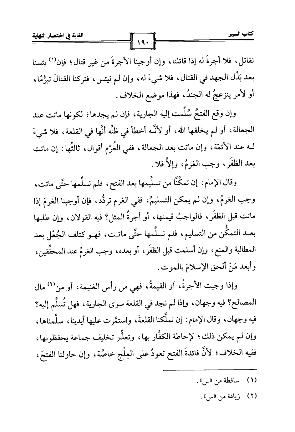 وإذا وجبت الأجرةُ، أو القيمةُ، فهي من رأس الغنيمة، أو من (¬2) مال المصالح؟ فيه وجهان، وإذا لم نجد في القلعة سوى الجارية، فهل تُسلَّم إليه؟ فيه وجهان، وقال الإِمام: إن تملَّكنا القلعةَ، واستمَّرت عليها أيدينا، سلَّمناها، وإن لم يمكن ذلك؛ لإحاطة الكفَّار بها، وتعذُّر تخليف جماعة يحفظونها، ففيه الخلاف؛ لأنَّ فائدةَ الفتح تعودُ على العِلْج خاصَّة، وإن حاولنا الفتحَ،