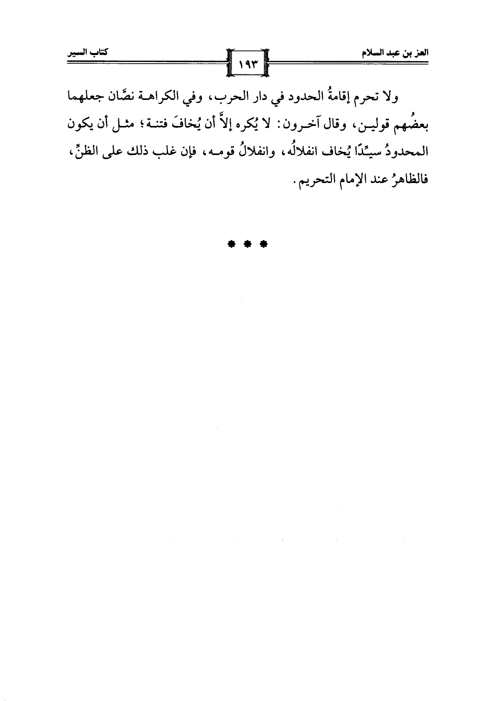 ولا تحرم إقامةُ الحدود في دار الحرب، وفي الكراهة نصَّان جعلهما بعضُهم قولين، وقال آخرون: لا يُكره إلَّا أن يُخافَ فتنة؛ مثل أن يكون المحدودُ سيِّدًا يُخاف انفلالُه، وانفلالُ قومه، فإن غلب ذلك على الظنِّ، فالظاهرُ عند الإمام التحريم.