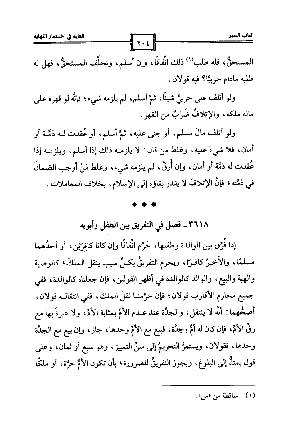 إذا فُرِّق بين الوالدة وطفلها، حَرُم اتِّفاقًا وإِن كانا كافِرَيْن، أو أحدُهما مسلمًا، والآخرُ كافرًا، ويحرم التفريقُ بكلِّ سبب ينقل الملكَ؛ كالوصية والهبة والبيع، والوالد كالوالدة في أظهر القولين، فإن جعلناه كالوالدة، ففي جميع محارم الأقارب قولان؛ فإن حرَّمنا نقلَ الملك، ففي انتقاله قولان، أصحُّهما: أنّه لا ينتقل، والجدَّة عند عدم الأمِّ بمثابة الأمِّ، ولا عبرةَ بها مع رقِّ الأمِّ، فإن كان له أمٌّ وجدَّة، فبيع مع الأمِّ وحدها، جاز، وإِن بيع مع الجدَّة وحدها، فقولان، ويسمرُّ التحريمُ إلى سنِّ التمييز، وهو سبع أو ثمان، وعلى قول يمتدُّ إلى البلوغ، ويجوز التفريقُ للضرورة؛ بأن تكون الأمُّ حرَّة، أو ملكًا