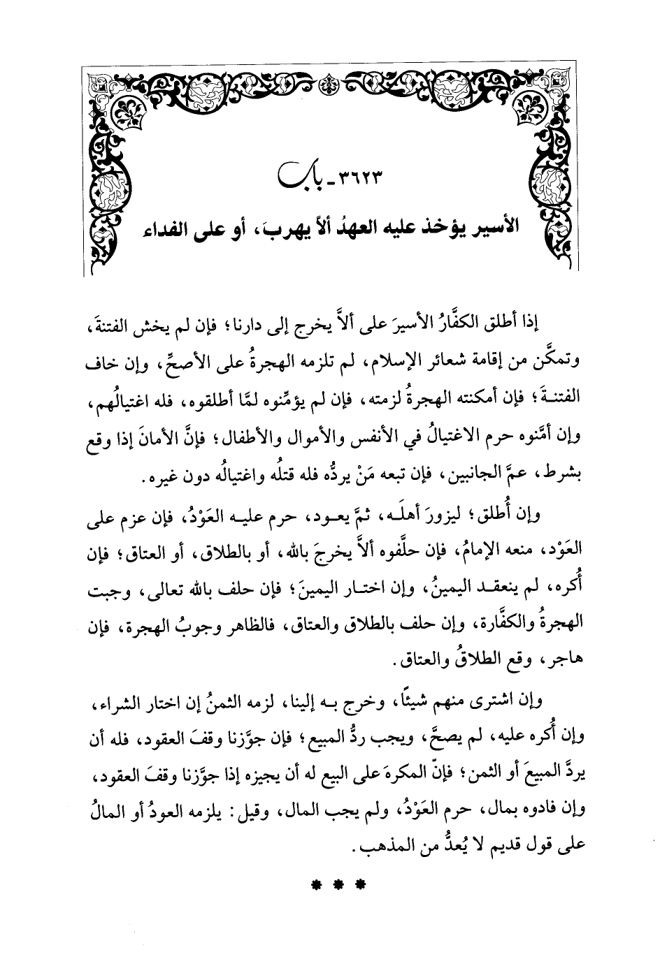 إذا أطلق الكفَّارُ الأسيرَ على ألَّا يخرج إلى دارنا؛ فإن لم يخش الفتنةَ، وتمكَّن من إقامة شعائر الإسلام، لم تلزمه الهجرةُ على الأصحِّ، وإِن خاف الفتنةَ؛ فإن أمكنته الهجرةُ لزمته، فإن لم يؤمِّنوه لمَّا أطلقوه، فله اغتيالُهم، وإِن أمَّنوه حرم الاغتيالُ في الأنفس والأموال والأطفال؛ فإنَّ الأمانَ إذا وقع بشرط، عمَّ الجانبين، فإن تبعه مَنْ يردُّه فله قتلُه واغتيالُه دون غيره.