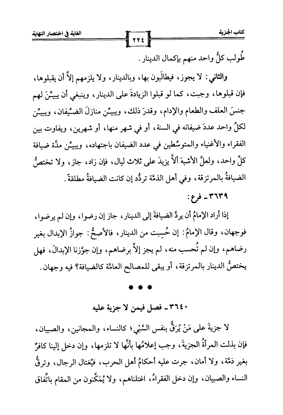 والثاني: لا يجوز، فيطالَبون بها، وبالدينار، ولا يلزمهم إلَّا أن يقبلوها، فإن قبلوها، وجبت، كما لو قبلوا الزيادةَ على الدينار، وينبغي أن يبيِّنَ لهم جنسَ العلف والطعام والإدام، وقدرَ ذلك، ويبيِّن منازلَ الضيِّفان، ويبيِّن لكلِّ واحد عددَ ضيفانه في السنة، أو في شهر منها، أو شهرين، ويفاوت بين الفقراء والأغنياء والمتوسِّطين في عدد الضيفان باجتهاده، ويبيِّن مدَّة ضيافة كلِّ واحد، ولعلَّ الأشبهَ ألَّا يزيدَ على ثلاث ليال، فإن زاد، جاز، ولا تختصُّ الضيافةُ بالمرتزقة، وفي أهل الذمَّة تردُّد إن كانت الضيافةُ مطلقةً.