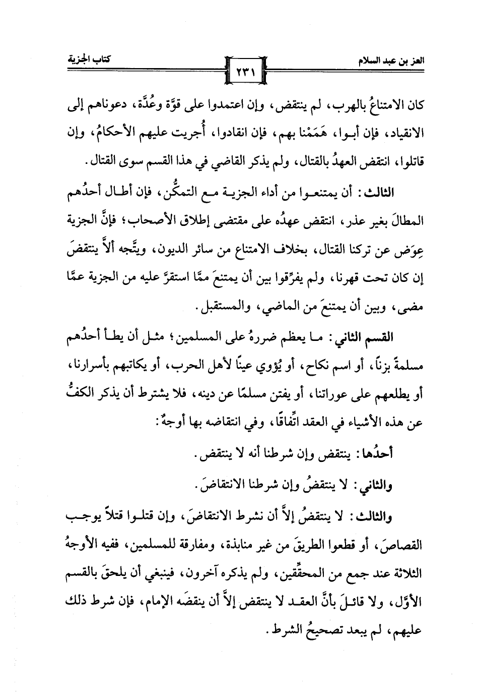 والثالث: لا ينتقضُ إلَّا أن نشرط الانتقاضَ، وإن قتلوا قتلًا يوجب القصاصَ، أو قطعوا الطريقَ من غير منابذة، ومفارقة للمسلمين، ففيه الأوجهُ الثلاثة عند جمع من المحقِّقين، ولم يذكره آخرون، فينبغي أن يلحقَ بالقسم الأوَّل، ولا قائلَ بأنَّ العقد لا ينتقض إلَّا أن ينقضَه الإمام، فإن شرط ذلك عليهم، لم يبعد تصحيحُ الشرط.