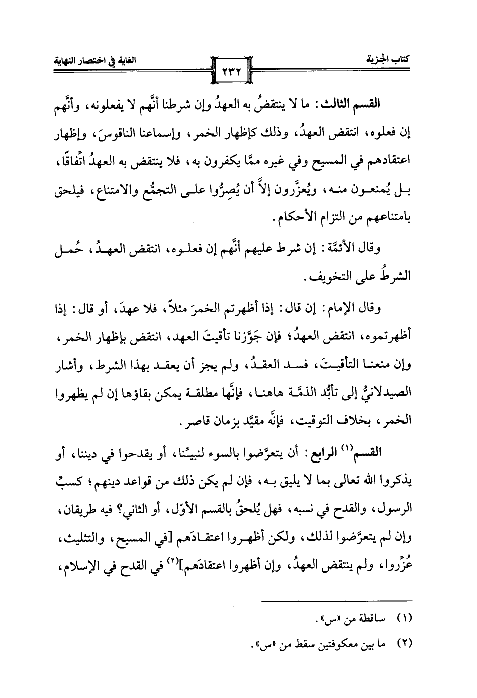 القسم (¬1) الرابع: أن يتعرَّضوا بالسوء لنبيِّنا، أو يقدحوا في ديننا، أو يذكروا الله تعالى بما لا يليق به، فإن لم يكن ذلك من قواعد دينهم؛ كسبِّ الرسول، والقدح في نسبه، فهل يُلحقُ بالقسم الأوّل، أو الثاني؟ فيه طريقان، وإِن لم يتعرَّضوا لذلك، ولكن أظهروا اعتقادَهم [في المسيح، والتثليث، عُزِّروا، ولم ينتقض العهدُ، وإن أظهروا اعتقادَهم] (¬2) في القدح في الإسلام،