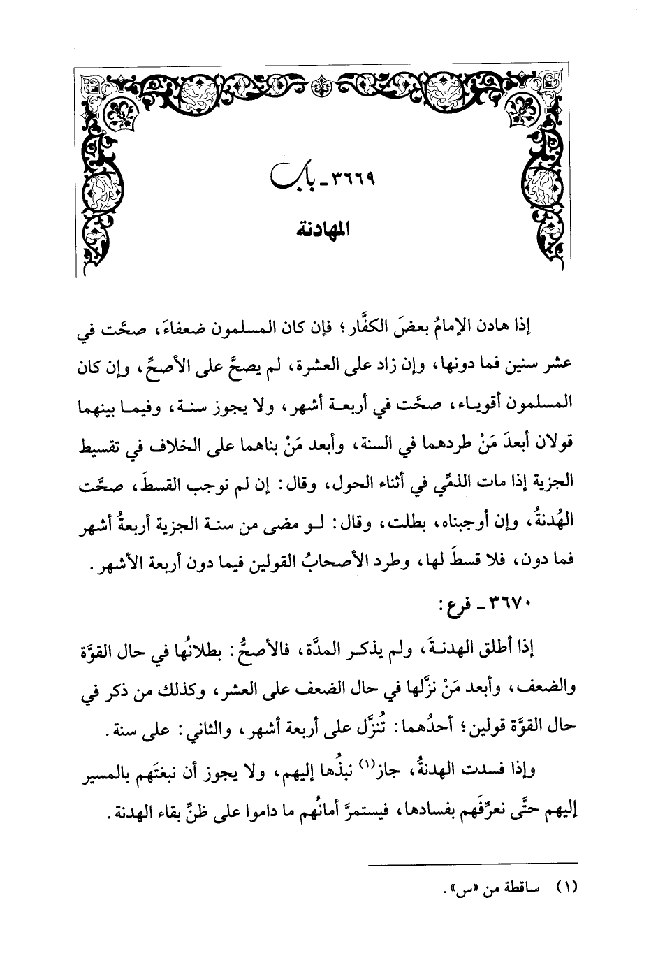 إذا هادن الإمامُ بعضَ الكفَّار؛ فإن كان المسلمون ضعفاءَ، صحَّت في عشر سنين فما دونها، وإن زاد على العشرة، لم يصحَّ على الأصحِّ، وإِن كان المسلمون أقوياء، صحَّت في أربعة أشهر، ولا يجوز سنة، وفيما بينهما قولان أبعدَ مَنْ طردهما في السنة، وأبعد مَنْ بناهما على الخلاف في تقسيط الجزية إذا مات الذميِّ في أثناء الحول، وقال: إن لم نوجب القسطَ، صحَّت الهُدنةُ، وإن أوجبناه، بطلت، وقال: لو مضى من سنة الجزية أربعةُ أشهر فما دون، فلا قسطَ لها، وطرد الأصحابُ القولين فيما دون أربعة الأشهر.