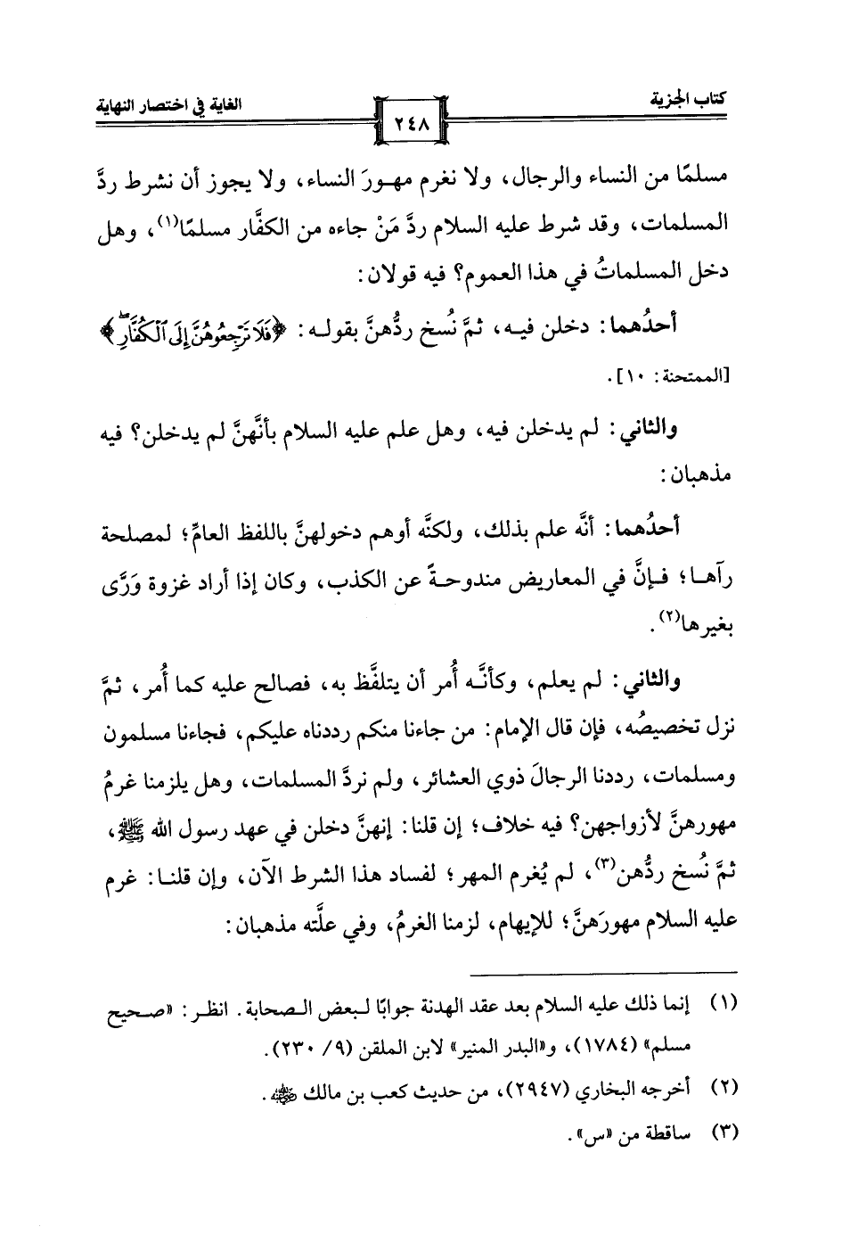 والثاني: لم يعلم، وكأنَّه أُمر أن يتلفَّظ به، فصالح عليه كما أُمر، ثمَّ نزل تخصيصُه، فإن قال الإمام: من جاءنا منكم رددناه عليكم، فجاءنا مسلمون ومسلمات، رددنا الرجالَ ذوي العشائر، ولم نردَّ المسلمات، وهل يلزمنا غرمُ مهورهنَّ لأزواجهن؟ فيه خلاف؛ إن قلنا: إنهنَّ دخلن في عهد رسول الله -صلى الله عليه وسلم-، ثمَّ نُسخ ردُّهن (¬3)، لم يُغرم المهر؛ لفساد هذا الشرط الآن، وإِن قلنا: غرم عليه السلام مهورَهنَّ؛ للإيهام، لزمنا الغرمُ، وفي علَّته مذهبان:
