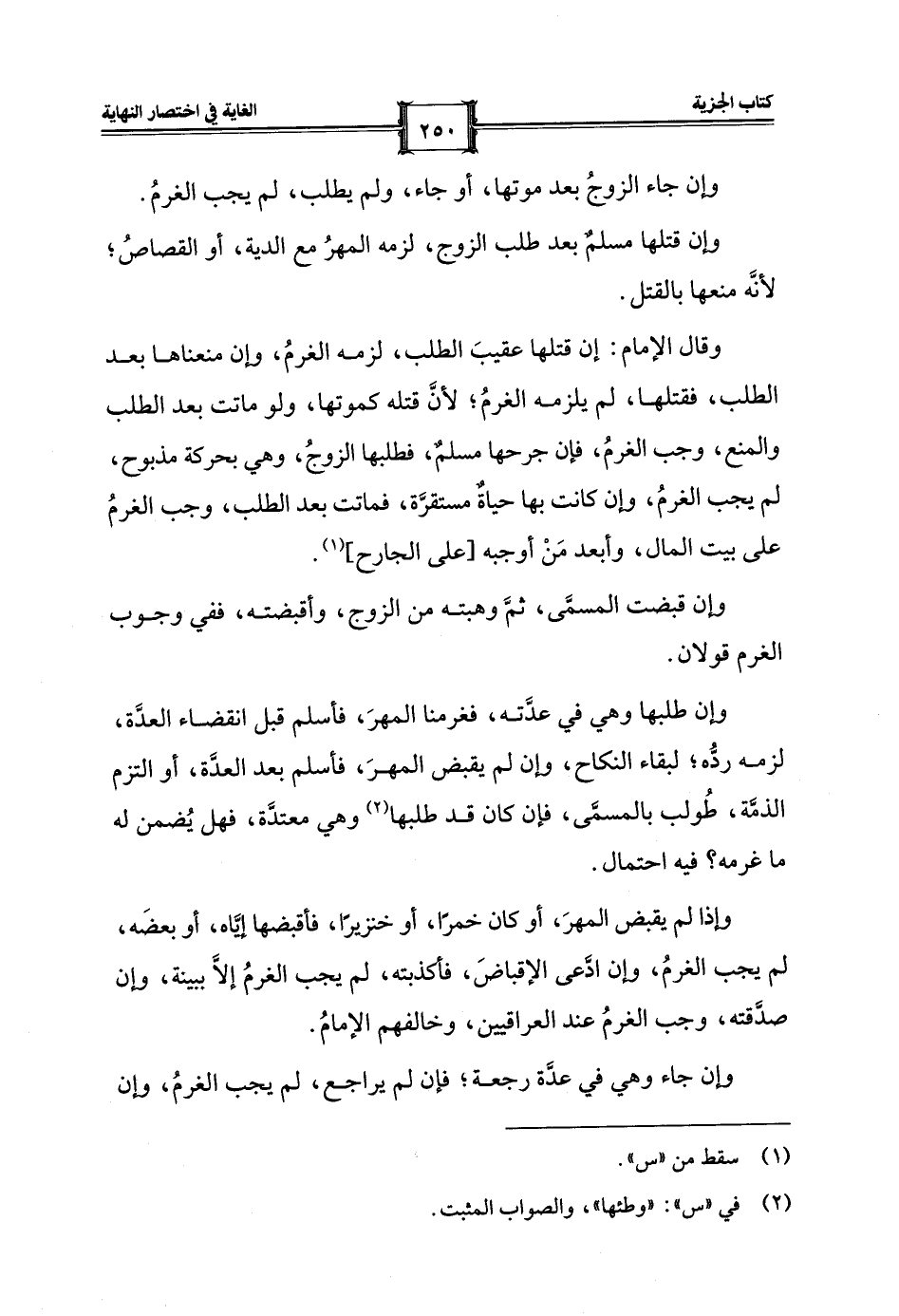 وقال الإمام: إن قتلها عقيبَ الطلب، لزمه الغرمُ، وإِن منعناها بعد الطلب، فقتلها، لم يلزمه الغرمُ؛ لأنَّ قتله كموتها، ولو ماتت بعد الطلب والمنع، وجب الغرمُ، فإن جرحها مسلمٌ، فطلبها الزوجُ، وهي بحركة مذبوح، لم يجب الغرمُ، وإِن كانت بها حياةٌ مستقرَّة، فماتت بعد الطلب، وجب الغرمُ على بيت المال، وأبعد مَنْ أوجبه [على الجارح] (¬1).