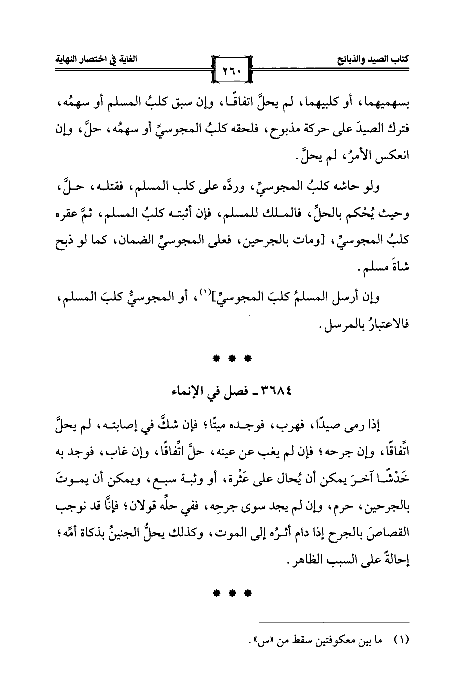 بسهميهما، أو كلبيهما، لم يحلَّ اتفاقًا، وإِن سبق كلبُ المسلم أو سهمُه، فترك الصيدَ على حركة مذبوح، فلحقه كلبُ المجوسيِّ أو سهمُه، حلَّ، وإِن انعكس الأمرُ، لم يحلَّ.