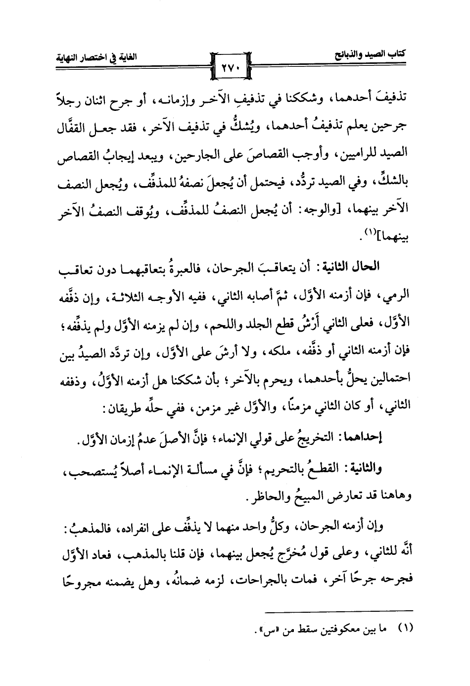 الحال الثانية: أن يتعاقبَ الجرحان، فالعبرةُ بتعاقبهما دون تعاقب الرمي، فإن أزمنه الأوَّل، ثمَّ أصابه الثاني، ففيه الأوجه الثلاثة، وإِن ذفَّفه الأوَّل، فعلى الثاني أَرْشُ قطع الجلد واللحم، وإِن لم يزمنه الأوَّل ولم يذفِّفه؛ فإن أزمنه الثاني أو ذفَّفه، ملكه، ولا أرشَ على الأوَّل، وإن تردَّد الصيدُ بين احتمالين يحل بأحدهما، ويحرم بالآخر؛ بأن شككنا هل أزمنه الأوَّلُ، وذففه الثاني، أو كان الثاني مزمنًا، والأوَّل غير مزمن، ففي حلِّه طريقان: