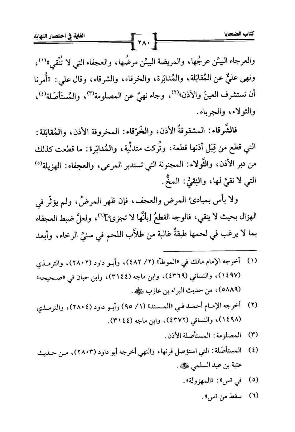والعرجاء البيِّن عرجُها، والمريضة البيِّن مرضُها، والعجفاء التي لا تُنْقي" (¬1)، ونهى عليٌّ عن المُقابَلة، والمُدابَرة، والخرقاء، والشرقاء، وقال علي: "أُمرنا أن نستشرف العينَ والأذن" (¬2)، وجاء نهيٌ عن المصلومة (¬3)، والمُستَأصَلة (¬4)، والثولاء، والجرباء.
