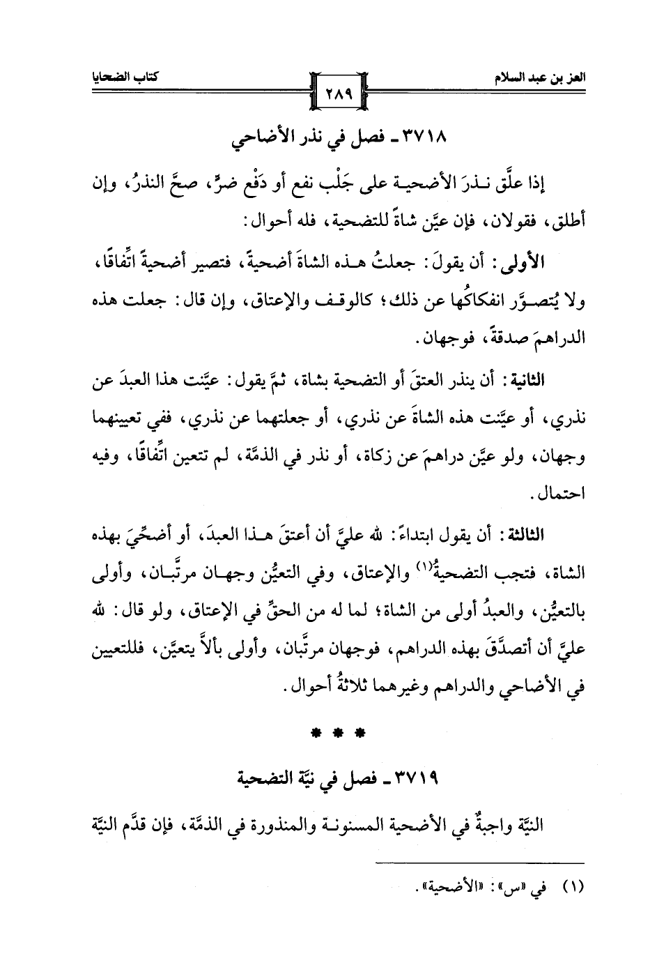 الثالثة: أن يقول ابتداءً: لله عليَّ أن أعتقَ هذا العبدَ، أو أضحِّيَ بهذه الشاة، فتجب التضحيةُ (¬1) والإعتاق، وفي التعيُّن وجهان مرتَّبان، وأولى بالتعيُّن، والعبدُ أولى من الشاة؛ لما له من الحقِّ في الإعتاق، ولو قال: لله عليَّ أن أتصدَّقَ بهذه الدراهم، فوجهان مرتَّبان، وأولى بألَّا يتعيَّن، فللتعيين في الأضاحي والدراهم وغيرهما ثلاثةُ أحوال.