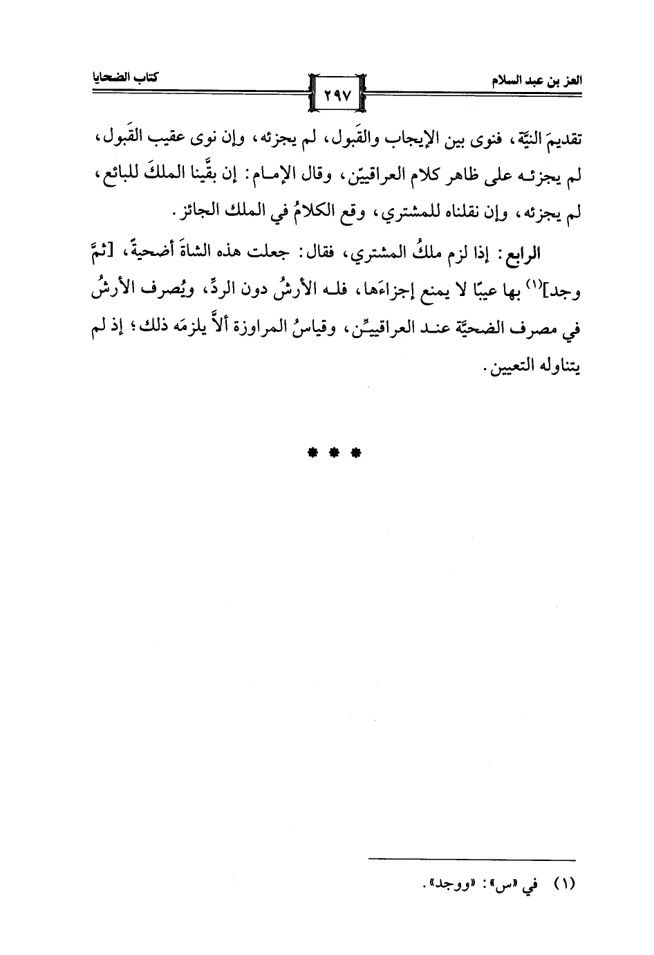 الرابع: إذا لزم ملكُ المشتري، فقال: جعلت هذه الشاةَ أضحية، [ثمَّ وجد] (¬1) بها عينًا لا يمنع إجزاءَها، فله الأرشُ دون الرد، ويُصرف الأرشُ في مصرف الضحيَّة عند العراقييِّن، وقياسُ المراوزة ألَّا يلزمَه ذلك؛ إذ لم يتناوله التعيين.