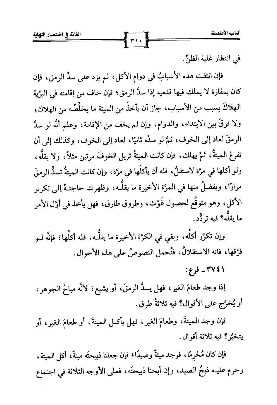فإن انتفت هذه الأسبابُ في دوام الأكل، لم يزد على سدِّ الرمق، فإن كان بمفازة لا يملك فيها قدميه إذا سدَّ الرمق؛ فإن خاف من إقامته في البرِّية الهلاكَ بسبب من الأسباب، جاز أن يأخذَ من الميتة ما يخلِّصُه من الهلاك، ولا فرقَ بين الابتداء، والدوام، وإن لم يخف من الإقامة، وعلم أنَّه لو سدَّ الرمقَ لعاد إلى الخوف، ثمَّ لو سدَّه ثانيًا، لعاد إلى الخوف، وكذلك إلى أن تفرغ الميتةُ، ثمَّ يهلك، فإن كانت الميتةُ تزيل الخوفَ مرتين مثلًا، ولا يقلُّه، ولو أكلها في مرَّة لاستقلَّ، فله أن يأكلَها في مرَّة، وإن كانت الميتةُ تسدُّ الرمقَ مرارًا، ويفضلُ منها في المرَّة الأخيرة ما يقلُّه، وظهرت حاجتهُ إلى تكرير الأكل، وهو متوقع لحصول غَوْث، وطروق طارق، فهل يأخذ في أوَّل الأمر ما يقلُّه؟ فيه تردُّد.