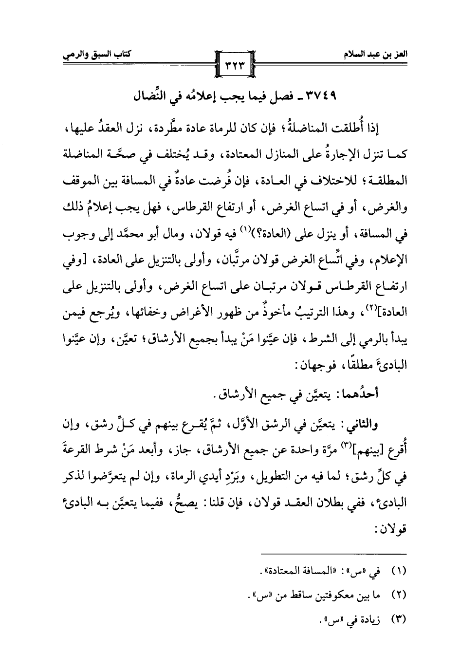 إذا أُطلقت المناضلةُ؛ فإن كان للرماة عادة مطَّردة، نزل العقدُ عليها، كما تنزل الإجارةُ على المنازل المعتادة، وقد يُختلف في صحَّة المناضلة المطلقة؛ للاختلاف في العادة، فإن فُرضت عادةٌ في المسافة بين الموقف والغرض، أو في اتساع الغرض، أو ارتفاع القرطاس، فهل يجب إعلامُ ذلك في المسافة، أو ينزل على (العادة؟ ) (¬1) فيه قولان، ومال أبو محمَّد إلى وجوب الإعلام، وفي اتِّساع الغرض قولان مرتَّبان، وأولى بالتنزيل على العادة، [وفي ارتفاع القرطاس قولان مرتبان على اتساع الغرض، وأولى بالتنزيل على العادة] (¬2)، وهذا الترتيبُ مأخوذٌ من ظهور الأغراض وخفائها، ويُرجع فيمن يبدأ بالرمي إلى الشرط، فإن عيَّنوا مَنْ يبدأ بجميع الأرشاق؛ تعيَّن، وإن عيَّنوا البادئَ مطلقًا، فوجهان: