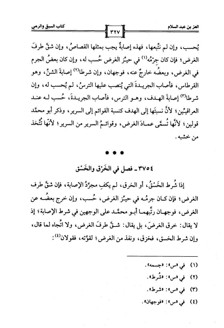 يُحسب، وإن لم نتِّبعها، فهذه إصابةٌ يجب بمثلها القصاصُ، وإن شقَّ طرفَ الغرض؛ فإن كان جِرْمُه (¬1) في حيِّز الغرض حُسب له، وإن كان بعضُ الجرم في الغرض، وبعضُه خارجٌ عنه، فوجهان، وإن شرطا (¬2) إصابةَ الشنِّ، وهو القرطاس، فأصاب الجريدةَ التي يُنصب عليها الترسُ، لم يُحسب له، وإن شرطا (¬3) إصابةَ الهدف، وهو الترس، فأصاب الجريدةَ، حُسب له عند العراقيِّين؛ لأنَّ نسبتَها إلى الهدف كنسبة القوائم إلى السرير، وذكر أبو محمَّد قولين؛ لأنَّها تُسمَّى عمادَ الغرض، وقوائمُ السرير من السرير؛ لأنّها تُتَّخذ من خشبه.