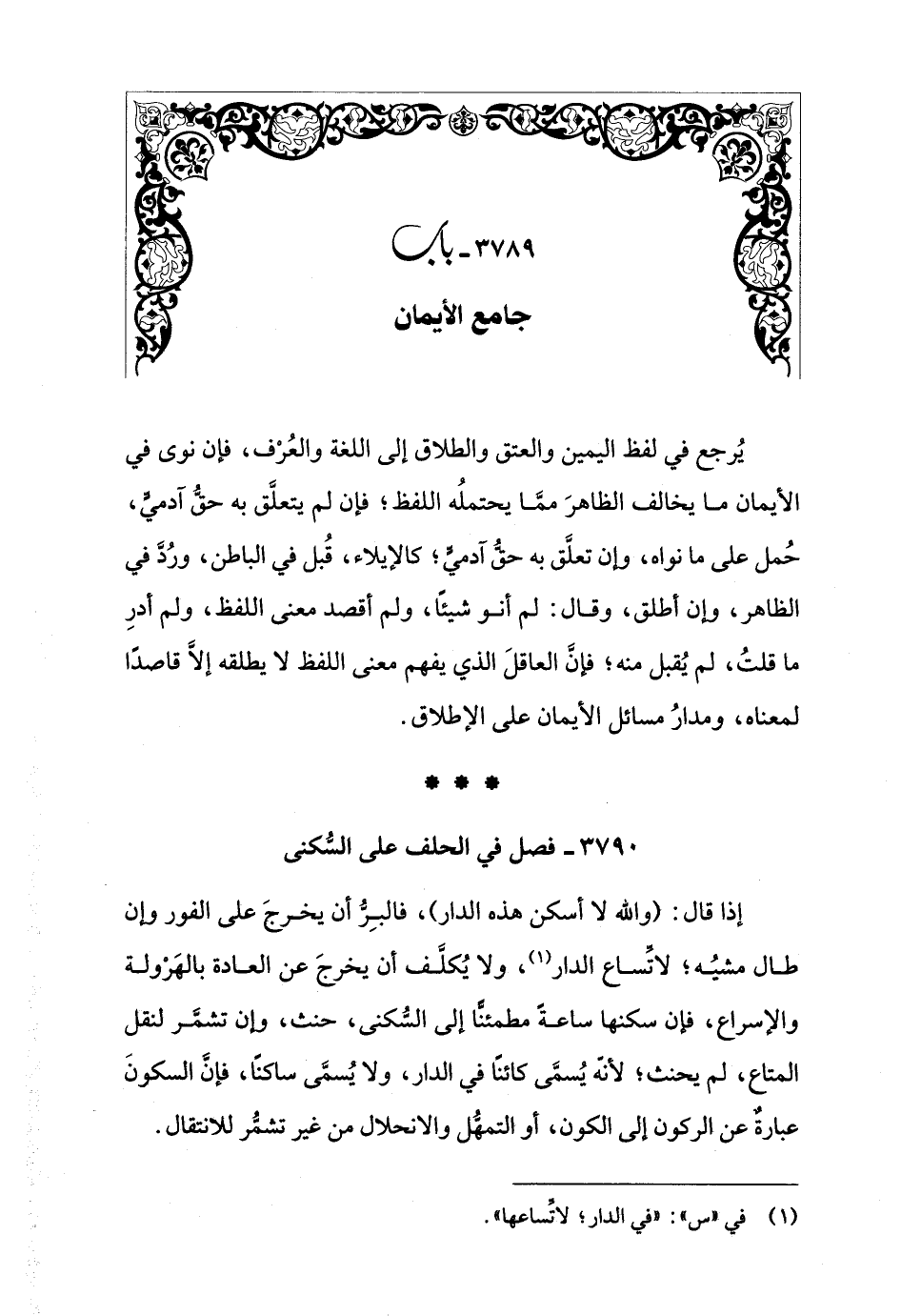 إذا قال: (والله لا أسكن هذه الدار)، فالبِرُّ أن يخرجَ على الفور وإن طال مشيُه؛ لاتساع الدار (¬1)، ولا يُكلَّف أن يخرجَ عن العادة بالهَرْولة والإسراع، فإن سكنها ساعةً مطمئنًّا إلى السُّكنى، حنث، وأن تشمَّر لنقل المتاع، لم يحنث؛ لأنّه يُسمَّى كائنًا في الدار، ولا يُسمّى ساكنًا، فإنَّ السكونَ عبارةٌ عن الركون إلى الكون، أو التمهُّل والانحلال من غير تشمُّر للانتقال.