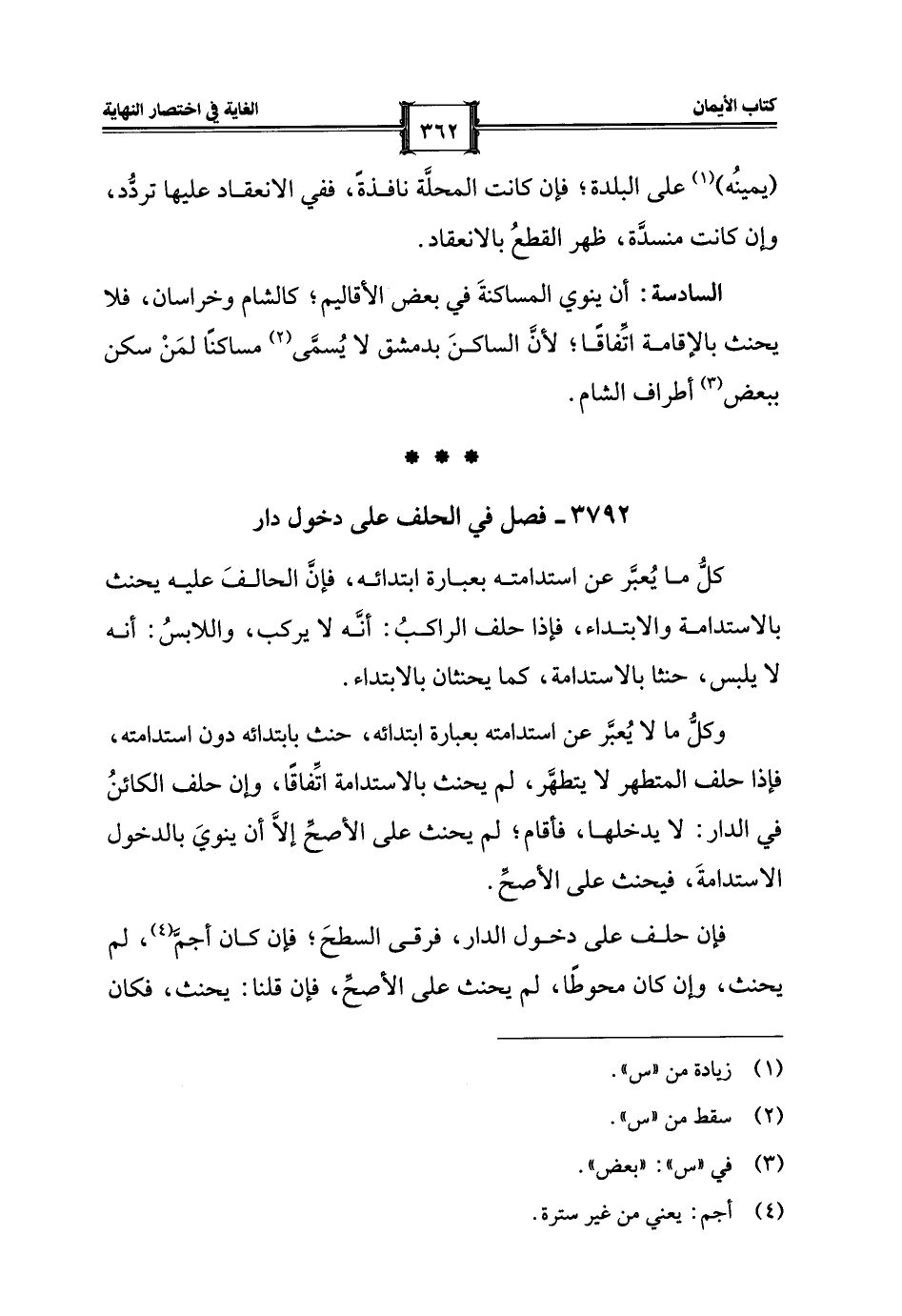 وكلُّ ما لا يُعبَّر عن استدامته بعبارة ابتدائه، حنث بابتدائه دون استدامته، فإذا حلف المتطهر لا يتطهَّر، لم يحنث بالاستدامة اتِّفاقًا، وإن حلف الكائنُ في الدارة لا يدخلها، فأقام؛ لم يحنث على الأصحِّ إلَّا أن ينويَ بالدخول الاستدامةَ، فيحنث على الأصحِّ.