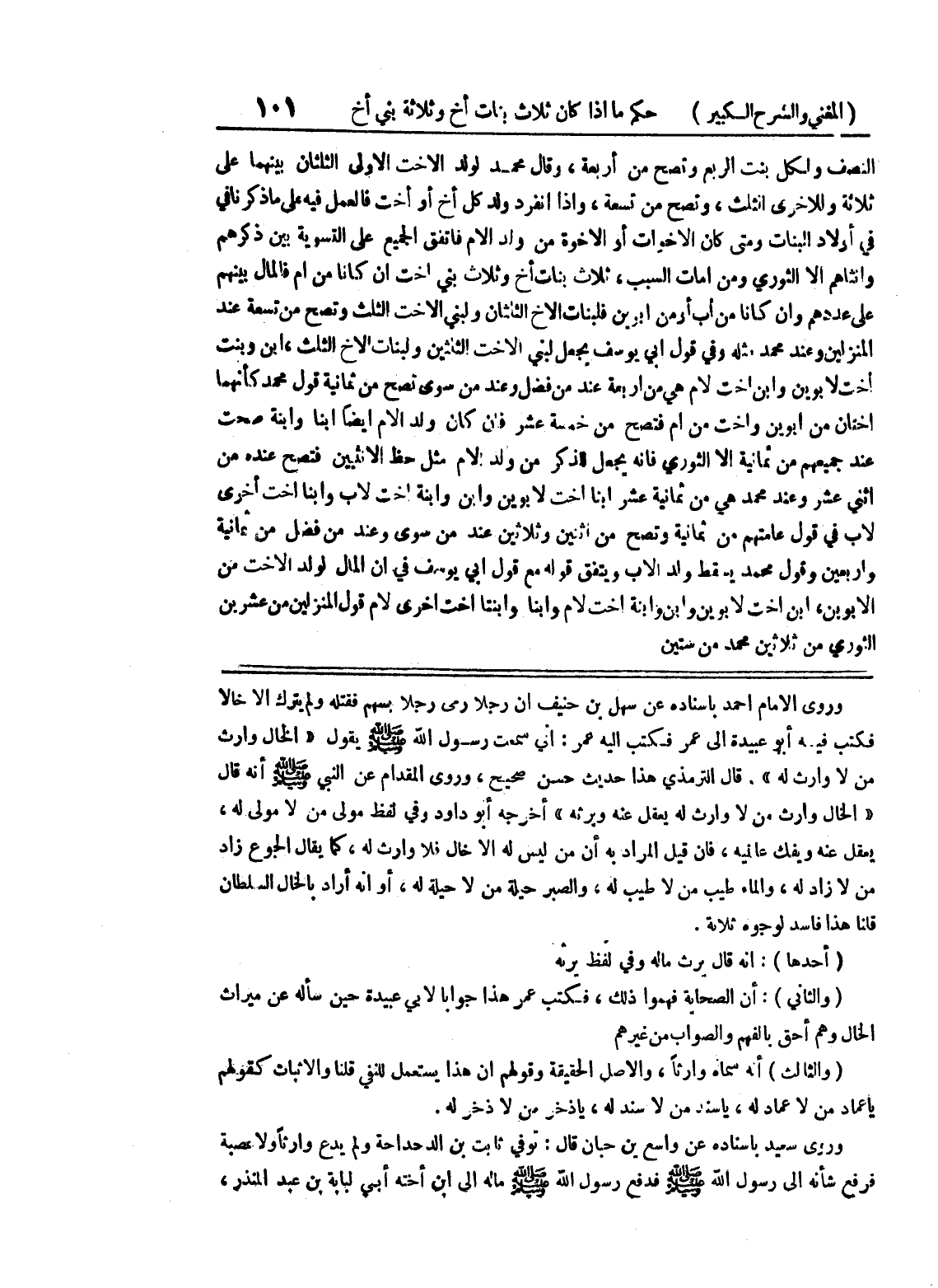 قال الترمذي هذا حديث حسن صحيح، وروى المقدام عن النبي صلى الله عليه وسلم إنه قال " الخال وارث من لا وارث له يعقل عنه ويرثه " أخرجه أبو داود وفي لفظ مولى من لا مولى له، يعقل عنه ويفك عانيه، فإن قيل المراد به أن من ليس له إلا خال فلا وارث له، كما يقال الجوع زاد من لا زاد له، والماء طيب من لا طيب له، والصبر حيلة من لا حيلة له، أو أنه أراد بالخال السلطان قلنا هذا فاسد لوجوه ثلاثة.