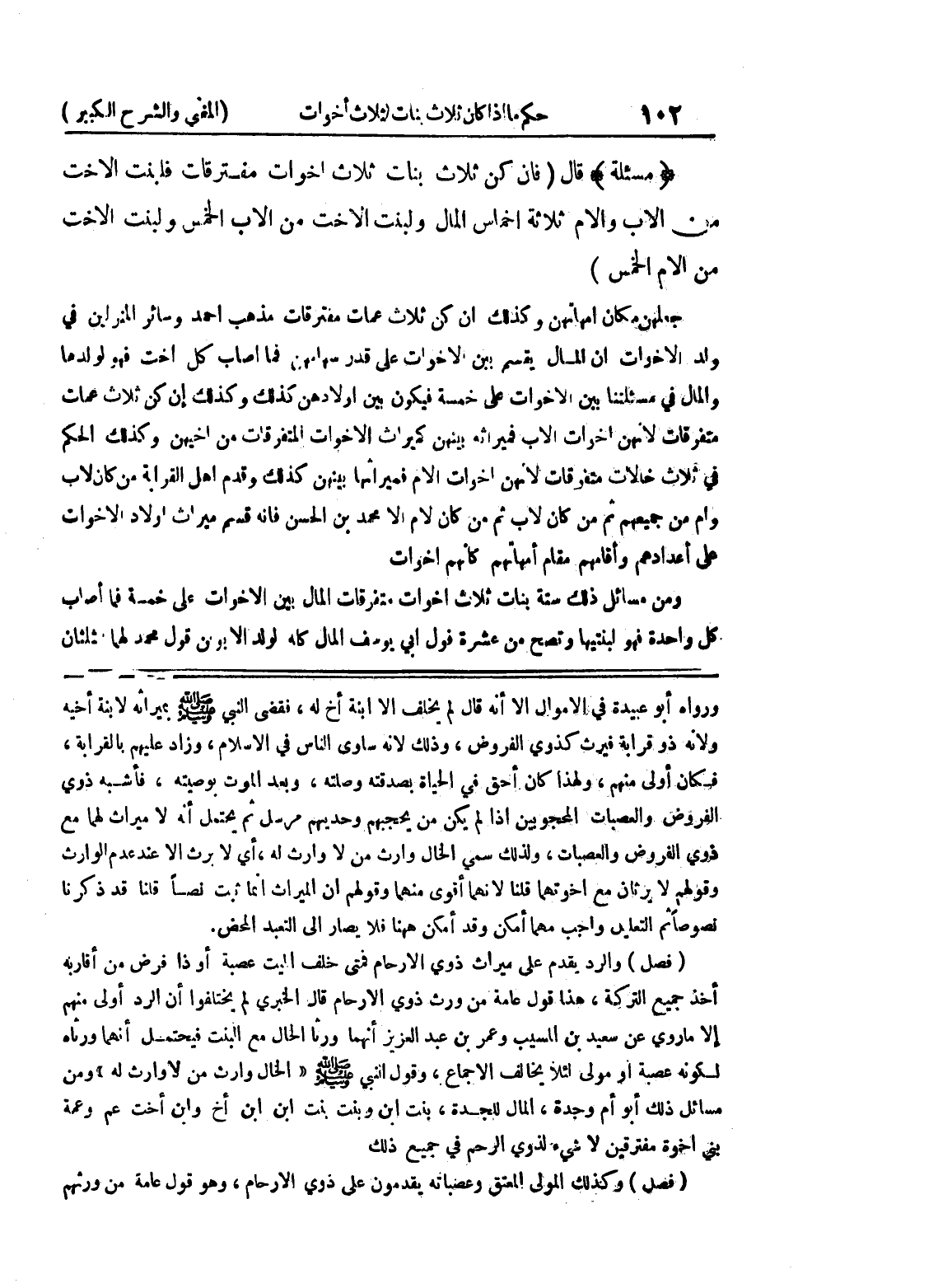 أخذ جميع التركة، هذا قول عامة من ورث ذوي الأرحام قال الخبري لم يختلفوا أن الرد أولى منهم إلا ما روي عن سعيد بن المسيب وعمر بن عبد العزيز أنهما ورثا الحال مع البنت فيحتمل أنهما ورثاه لكونه عصبة أو مولى لئلا يخالف الاجماع، وقول النبي صلى الله عليه وسلم " الخال وارث من لا وارث له " ومن مسائل ذلك أبو أم وجدة، المال للجدة، بنت ابن وبنت بنت ابن ابن أخ وابن أخت عم وعمة بني اخوة مفترقين لا شئ لذوي الرحم في جميع ذلك (فصل) وكذلك المولى المعتق وعصباته يقدمون على ذوي الأرحام، وهو قول عامة من ورثهم