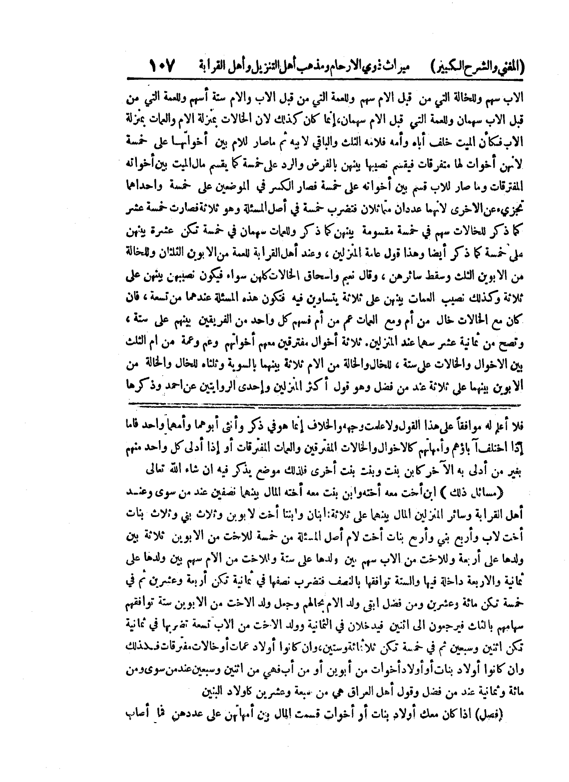 أهل القرابة وسائر المنزلين المال بينهما على ثلاثة: ابنان وابنتا أخت لابوبن وثلاث بني وثلاث بنات أخت لأب وأربع بني وأربع بنات أخت لأم أصل المسألة من خمسة للأخت من الأبوين ثلاثة بين ولدها على أربعة وللأخت من الأب سهم بين ولدها على ستة وللأخت من الأم سهم بين ولدها على ثمانية والأربعة داخلة فيها والستة توافقها بالنصف فتضرب نصفها في ثمانية تكن أربعة وعشرين ثم في خمسة تكن مائة وعشرين ومن فضل أبقى ولد الأم بحالهم وجعل ولد الأخت من الأبوين ستة توافقهم سهامهم بالثلث فيرجعون إلى اثنين فيدخلان في الثمانية وولد الأخت من الأب تسعة تضربها في ثمانية تكن اثنين وسبعين ثم في خمسة تكن ثلاثمائة وستين، وإن كانوا أولاد عمات أو خالات مفترقات فكذلك وإن كانوا أولاد بنات أو أولاد أخوات من أبوين أو من أب فهي من اثنين وسبعين عند من سوى ومن مائة وثمانية عند من فضل وقول أهل العراق هي من سبعة وعشرين كأولاد البنين (فصل) إذا كان معك أولاد بنات أو أخوات قسمت المال بين أمهاتهن على عددهن فما أصاب