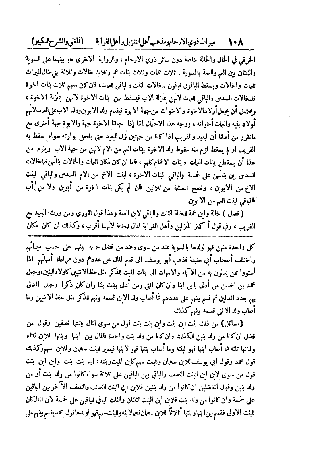 كل واحدة منهن فهو لولدها بالسوية عند من سوى وعند من فضل جعله بينهم على حسب ميراثهم واختلف أصحاب أبي حنيفة فذهب أبو يوسف إلى قسم المال على عددهم دون مراعاة أمهاتهم إذا استووا ممن يدلون به من الآباء والأمهات إلى بنات الميت للذكر مثل حظ الأنثيين كأولاد البنين، وجعل محمد بن الحسن من أدلى بابن ابنا وإن كانت أنثى ومن أدلى ببنت بنتا وإن كان ذكراً وجعل المدلى بهم بعدد المدلين ثم قسم بينهم على عددهم فما أصاب ولد الابن قسمه بينهم للذكر مثل حظ الأنثيين وما أصاب ولد الأنثى قسمه بينهم كذلك (مسائل) من ذلك بنت ابن بنت وابن بنت بنت قول من سوى المال بينهما نصفين وقول من فضل إن كانا من ولد بنين فكذلك وإن كانا من ولد بنت واحدة فالمال بين ابنها وبنتها للابن ثلثاه ولبنتها ثلثه فما أصاب ابنها فهو لبنته وما أصاب بنتها فهو لابنها فيصير للبنت سهمان وللابن سهم وكذلك قول محمد وقول أبي يوسف للابن سهمان وللبنت سهم كابن الميت وبنته: ابنا بنت بنت وابن ابن بنت قول من سوى لابن ابن البنت النصف والباقي بين الباقين على ثلاثة سواء كانوا من ولد بنت أو من