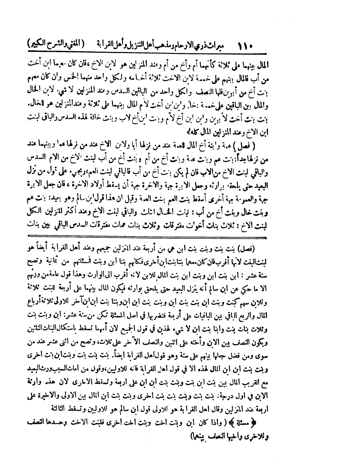 بنت بنت بنت وبنت ابن بنت أخرى وبنت بنت ابن ابن المال لهذه إلا في قول أهل القرابة فإنه للأوليين، وقول من أمات السبب ورث البعيد مع القريب المال بين بنت ابن بنت وبنت بنت ابن ابن على أربعة وتسقط الأخرى لأن هذه وارثة الابن في أول درجة: بنت بنت وبنت بنت بنت أخرى وبنت بنت ابن المال بين الأولى والأخيرة على أربعة عند المنزلين وقال اهل القرابة وهو للأولى قول ابن سالم هو للأوليين وتسقط الثالثة (مسألة) (وإذا كان ابن وبنت أخت وبنت أخت أخرى فلبنت الأخت وحدها النصف وللأخرى وأخيها النصف بينهما)