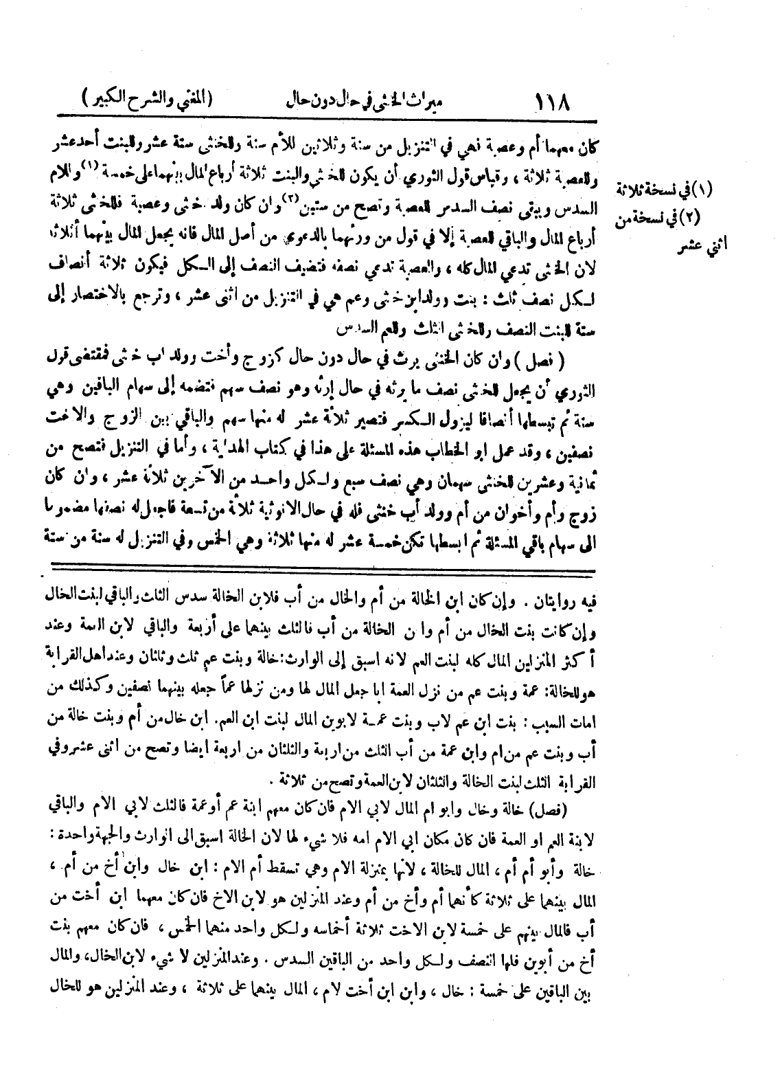وإن كان ابن الخالة من أم والخال من أب فلابن الخالة سدس الثالث والباقي لبنت الخال وإن كانت بنت الخال من أم وابن الخالة من أب فالثلث بينهما على أربعة والباقي لابن العمة وعند أكثر المنزلين المال كله لبنت العم لانه أسبق إلى الوارث: خالة وبنت عم ثلث وثلثان وعند أهل القرابة هو للخالة: عمة وبنت عم من نزل العمة أبا جعل المال لها ومن نزلها عماً جعله بينهما نصفين وكذلك من أمات السبب: بنت ابن عم لأب وبنت عمة لأبوين المال لبنت ابن العم: ابن خال من أم وبنت خالة من أب وبنت عم من أم وابن عمة من أب الثلث من أربعة والثلثان من أربعة أيضاً وتصح من اثني عشر وفي القرابة الثلث لبنت الخالة والثلثان لابن العمة وتصح من ثلاثة.