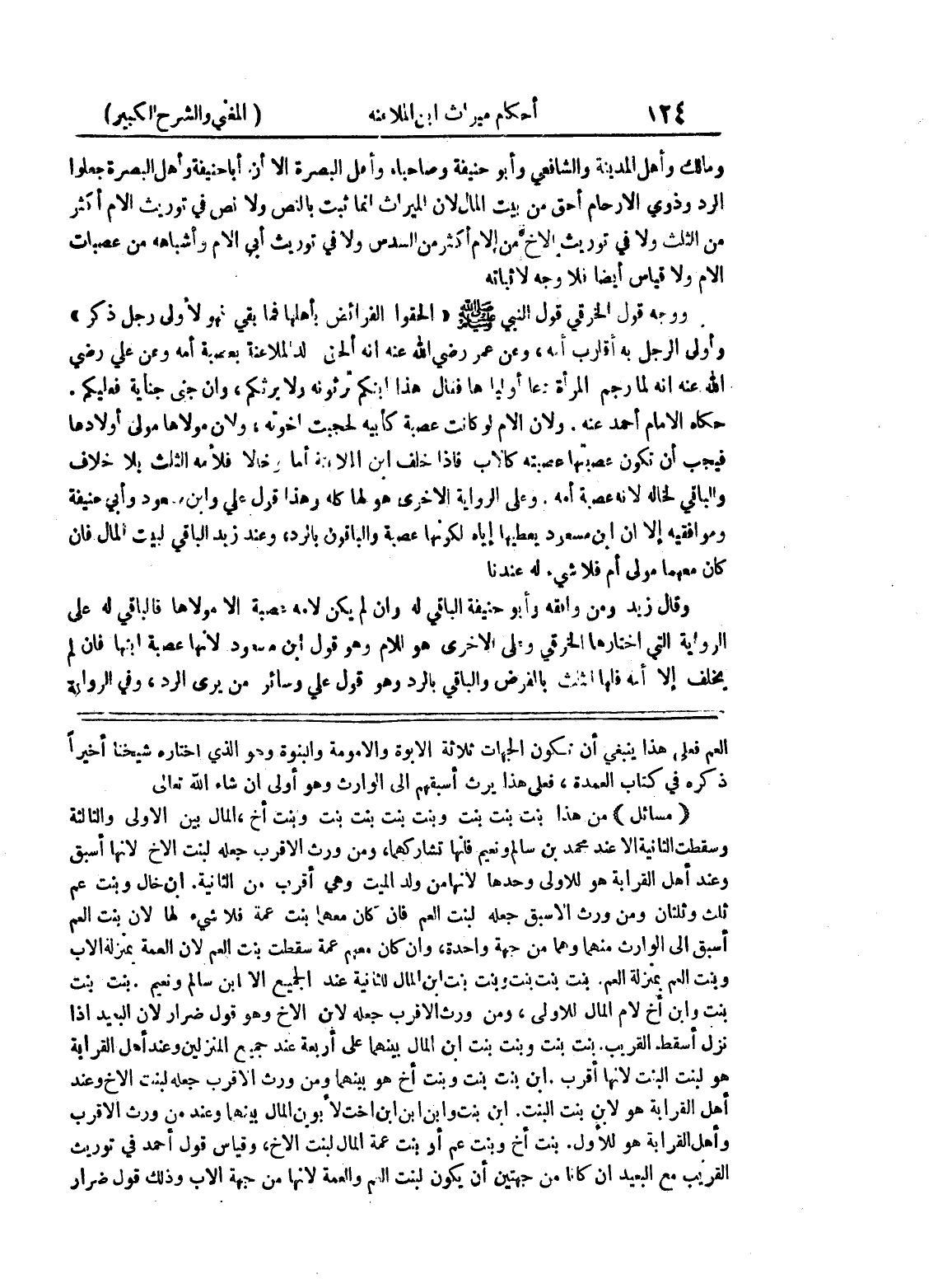 العم فعلى هذا ينبغي أن تكون الجهات ثلاثة الأبوة والأمومة والبنوة وهو الذي اختاره شيخنا أخيراً ذكره في كتاب العمدة، فعلى هذا يرث أسبقهم إلى الوارث وهو أولى إن شاء الله تعالى (مسائل) من هذا بنت بنت بنت وبنت بنت بنت بنت وبنت أخ، المال بين الأولى والثالثة وسقطت الثانية إلا عند محمد بن سالم ونعيم فإنها تشاركهما، ومن ورث الأقرب جعله لبنت الأخ لأنها أسبق وعند أهل القرابة هو للأولى وحدها لأنها من ولد الميت وهي أقرب من الثانية.