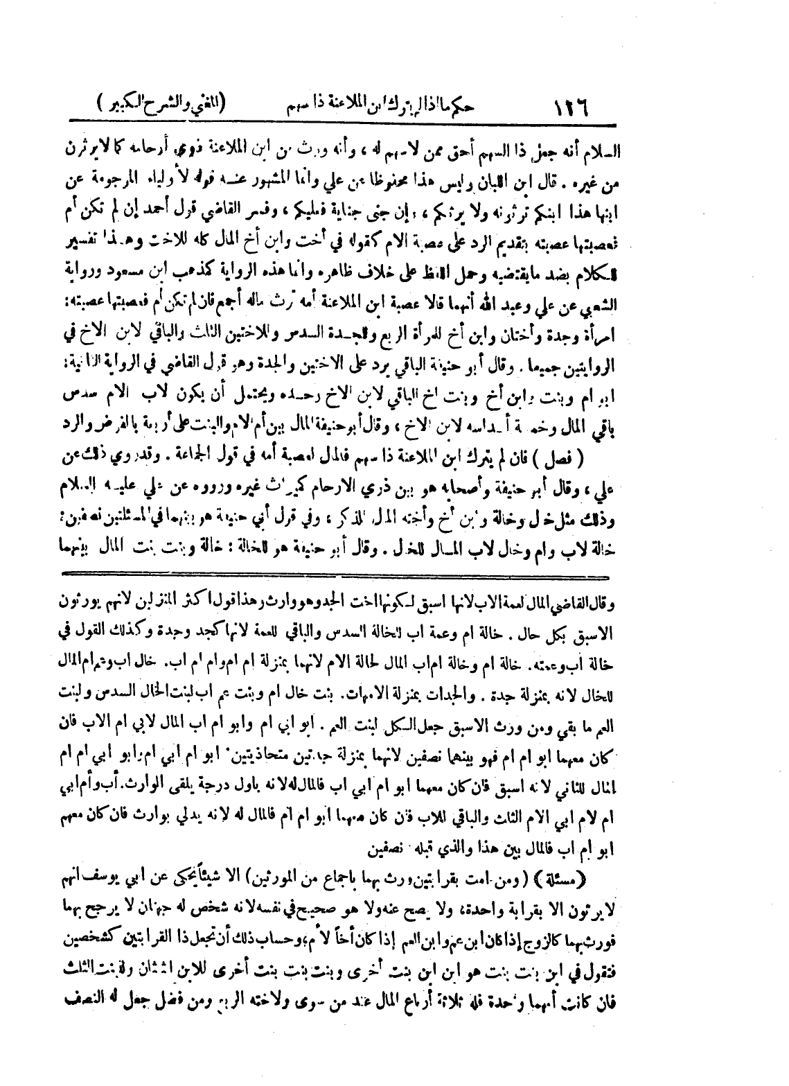 أب وأم أبي أم لأم أبي الأم الثلث والباقي للأب فإن كان معهما ابوام أم فالمال له لأنه يدلي بوارث فإن كان معهم ابوام أب فالمال بين هذا والذي قبله نصفين (مسألة) (ومن أمت بقرابتين ورث بهما باجماع من المورثين) إلا شيئاً يحكى عن أبي يوسف أنهم لا يرثون إلا بقرابة واحدة، ولا يصح عنه ولا هو صحيح في نفسه لأنه شخص له جهتان لا يرجح بهما