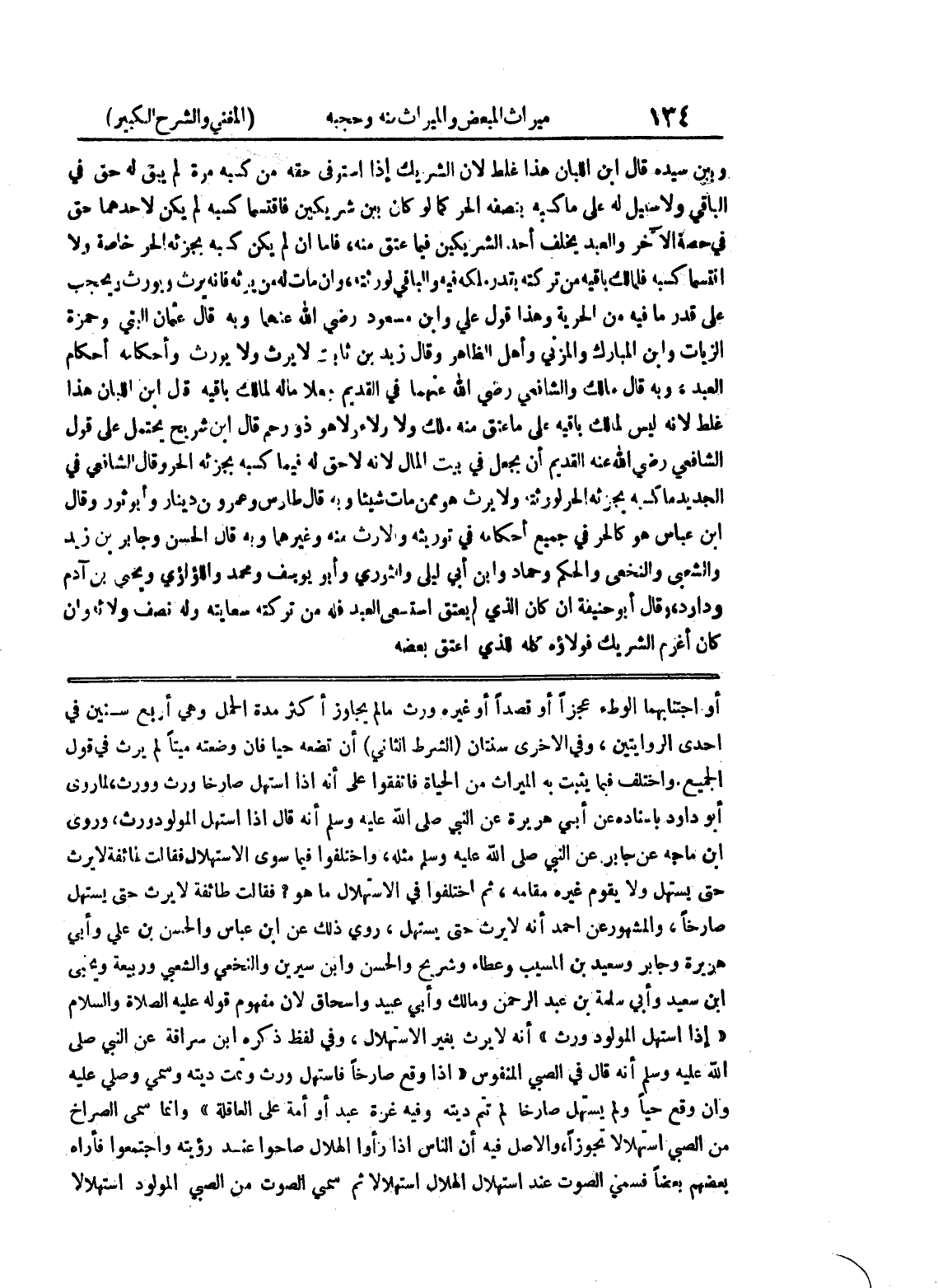 أو اجتنابهما الوطئ عجزاً أو قصداً أو غيره ورث ما لم يجاوز أكثر مدة الحمل وهي أربع سنين في إحدى الروايتين، وفي الأخرى سنتان (الشرط الثاني) أن تضعه حيا فإن وضعته ميتاً لم يرث في قول الجميع واختلف فيما يثبت به الميراث من الحياة فأتفقوا على أنه إذا استهل صارخاً ورث وورث، لما روى أبو داود بإسناده عن أبي هريرة عن النبي صلى الله عليه وسلم أنه قال إذا استهل المولود ورث، وروى ابن ماجة عن جابر عن النبي صلى الله عليه وسلم مثله واختلفوا فيما سوى الاستهلال فقالت طائفة لا يرث حتى يستهل ولا يقوم غيره مقامه، ثم اختلفوا في الاستهلال ما هو؟ فقالت طائفة لا يرث حتى يستهل