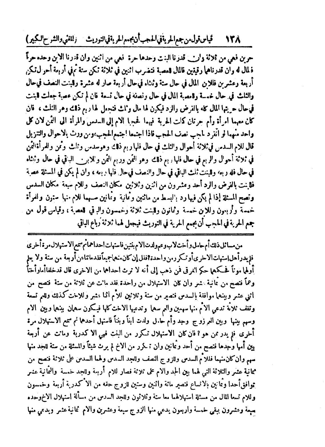 من مسائل ذلك أم حامل وأخت لأب وعم ولدت الأم بنتين فاستهلت إحداهما ثم سمع الاستهلال مرة أخرى فلم يدر أهل استهلت الأخرى أو تكرر من واحدة؟ فقل إن كان منهما جميعاً فقد ماتتا عن أربعة من ستة ولا يعلم أولهما موتاً فحكمهما حكم الغرقي فمن ذهب إلى أنه لا ترث إحداهما من الأخرى قال قد خلفا أماً وأختاً وعماً فتصح من ثمانية عشر وإن كان الاستهلال من واحدة فقد ماتت عن ثلاثة من ستة فتصح من اثني عشر وبينهما موافقة بالسدس فتصير من ستة وثلاثين للام واثنا عشر وللأخت كذلك وللعم تسعة وتقف ثلاثة تدعي الأم منها سهمين والعم سهما وتدعيها الأخت كلها فيكون سهمان بينهما وبين الأم وسهم بينها وبين العم زوج وجد وأم حامل ولدت ابناً وبنتاً فاستهل أحدهما ثم سمع الاستهلال مرة أخرى فلم يدر ممن هو؟ فإن كان الاستهلال تكرر من البنت فهي الأكدرية وماتت عن أربعة بين أمها وجدها فتصح من أحد وثمانين وإن تكرر من الأخ لم يرث شيئاً والمسألة من ستة للجد منها سهم وإن كان منهما فللأم السدس وللزوج النصف وللجد السدس ولهما السدس على ثلاثة فتصح من ثمانية عشر والثلاثة التي لهما بين الجد والأم على ثلاثة فصار للأم أربعة وللجد خمسة والثمانية عشر توافق أحدا وثمانين بالاتساع فتصير مائة واثنين وستين للزوج حقه من الأكدرية أربعة وخمسون وللأم تسعا المال من مسألة استهلالهما معا ستة وثلاثون وللجد السدس من مسألة استهلال الأخ وحده