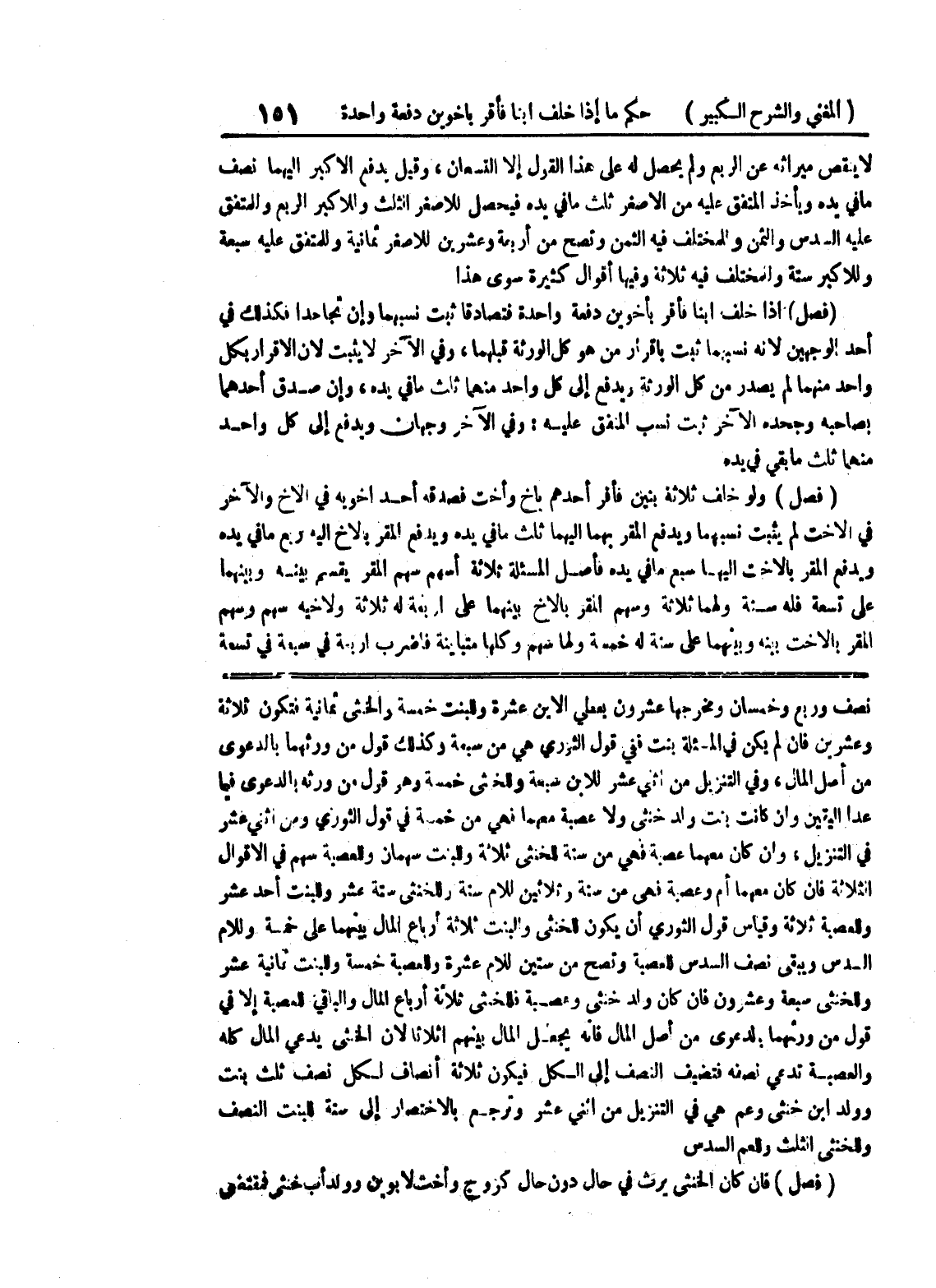 من أصل المال، وفي التنزيل من اثني عشر للابن سبعة وللخنثى خمسة وهو قول من ورثه بالدعوى فيما عدا اليقين وإن كانت بنت ولد خنثى ولا عصبة معهما فهي من خمسة في قول الثوري ومن اثني عشر في التنزيل، وإن كان معهما عصبة فهي من ستة للخنثى ثلاثة وللبنت سهمان وللعصبة سهم في الأقوال الثلاثة فإن كان معهما أم وعصبة فهي من ستة وثلاثين للأم ستة وللخنثى ستة عشر وللبنت أحد عشر وللعصبة ثلاثة وقياس قول الثوري أن يكون للخنثى والبنت ثلاثة أرباع المال بينهما على خمسة وللأم السدس ويبقى نصف السدس للعصبة وتصح من ستين للام عشرة وللعصبة خمسة وللبنت ثمانية عشر وللخنثى سبعة وعشرون فإن كان ولد خنثى وعصبة فللخنثى ثلاثة أرباع المال والباقي للعصبة إلا في قول من ورثهما بالدعوى من أصل المال فإنه يجعل المال بينهم أثلاثاً لأن الخنثى يدعي المال كله والعصبة تدعي نصفه فتضيف النصف إلى الكل فيكون ثلاثة أنصاف لكل نصف ثلث بنت وولد ابن خنثى وعم هي في التنزيل من اثني عشر وترجع بالاختصار إلى ستة للبنت النصف وللخنثى الثلث وللعم السدس (فصل) فإن كان الخنثى يرث في حال دون حال كزوج وأخت لأبوين وولد أب خنثى فمقتضى