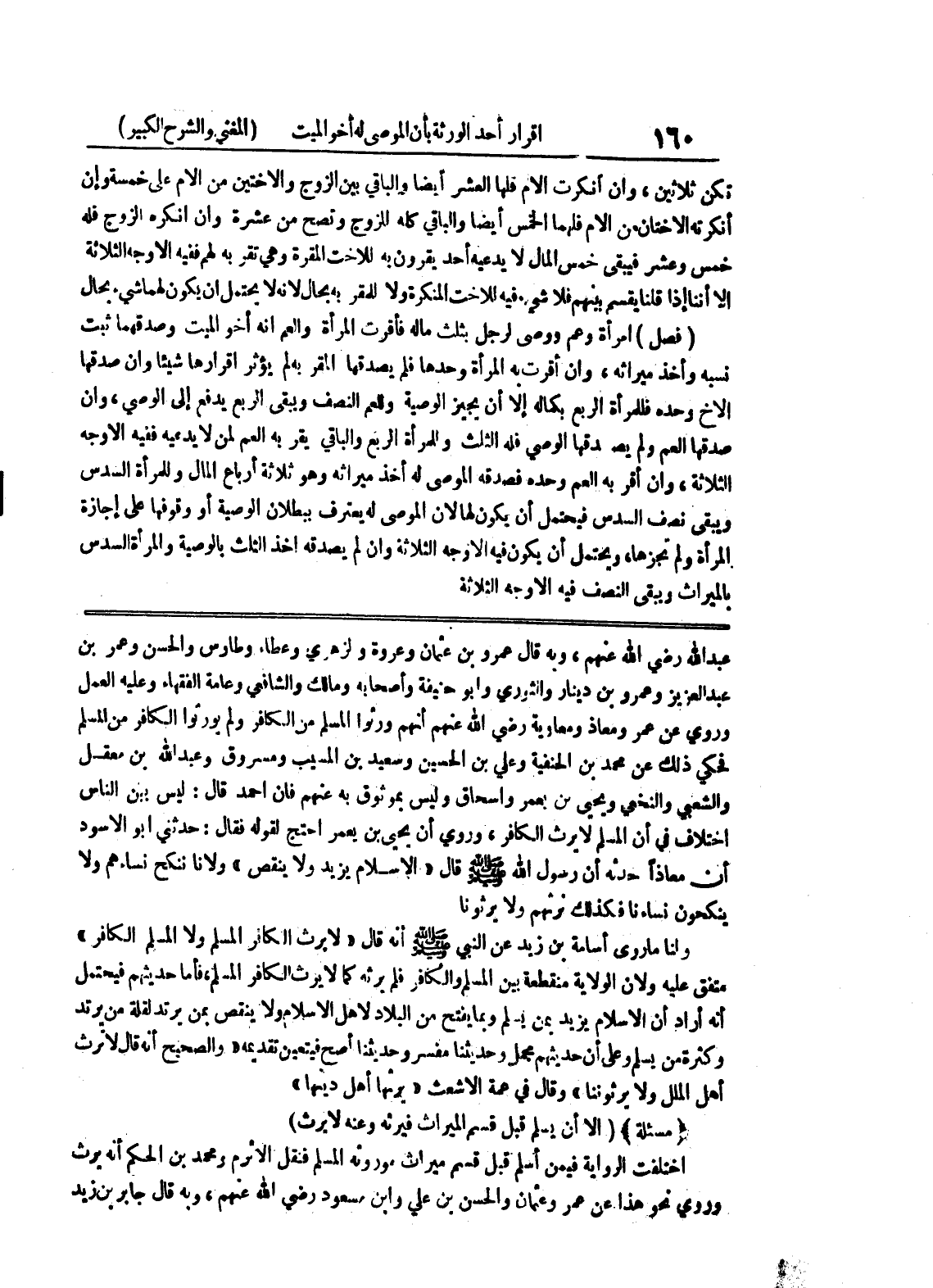 عبد الله رضي الله عنهم، وبه قال عمرو بن عثمان وعروة والزهري وعطاء وطاوس والحسن وعمر بن عبد العزيز وعمرو بن دينار والثوري وأبو حنيفة وأصحابه ومالك والشافعي وعامة الفقهاء وعليه العمل وروي عن عمر ومعاذ ومعاوية رضي الله عنهم أنهم ورثوا المسلم من الكافر ولم يورثوا الكافر من المسلم فحكي ذلك عن محمد بن الحنفية وعلي بن الحسين وسعيد بن المسيب ومسروق وعبد الله بن معقل والشعبي والنخعي ويحيى بن يعمر واسحاق وليس بموثوق به عنهم فإن أحمد قال: ليس بين الناس اختلاف في أن المسلم لا يرث الكافر، وروي أن يحيى بن يعمر احتج لقوله فقال: حدثني أبو الأسود أن معاذاً حدثه أن رسول الله صلى الله عليه وسلم قال " الإسلام يزيد ولا ينقص " ولأنا ننكح نساءهم ولا ينكحون نساءنا فكذلك نرثهم ولا يرثونا ولنا ما روى أسامة بن زيد عن النبي صلى الله عليه وسلم أنه قال " لا يرث الكافر المسلم ولا المسلم الكافر " متفق عليه ولأن الولاية منقطعة بين المسلم والكافر فلم يرثه كما لا يرث الكافر المسلم، فاما حديثهم فيحتمل أنه أراد أن الإسلام يزيد بمن يسلم وبما يفتح من البلاد لأهل الإسلام ولا ينقص بمن يرتد لقلة من يرتد وكثرة من يسلم وعلى أن حديثهم مجمل وحديثنا مفسر وحديثنا أصح فيتعين تقديمه " والصحيح أنه قال لا ترث أهل الملل ولا يرثوننا " وقال في عمة الأشعث " يرثها أهل دينها " (مسألة) (إلا أن يسلم قبل قسم الميراث فيرثه وعنه لا يرث) اختلفت الرواية فيمن أسلم قبل قسم ميراث موروثه المسلم فنقل الاثرم ومحمد بن الحكم أنه يرث وروي نحو هذا عن عمرو وعثمان والحسن بن علي وابن مسعود رضي الله عنهم، وبه قال جابر بن زيد