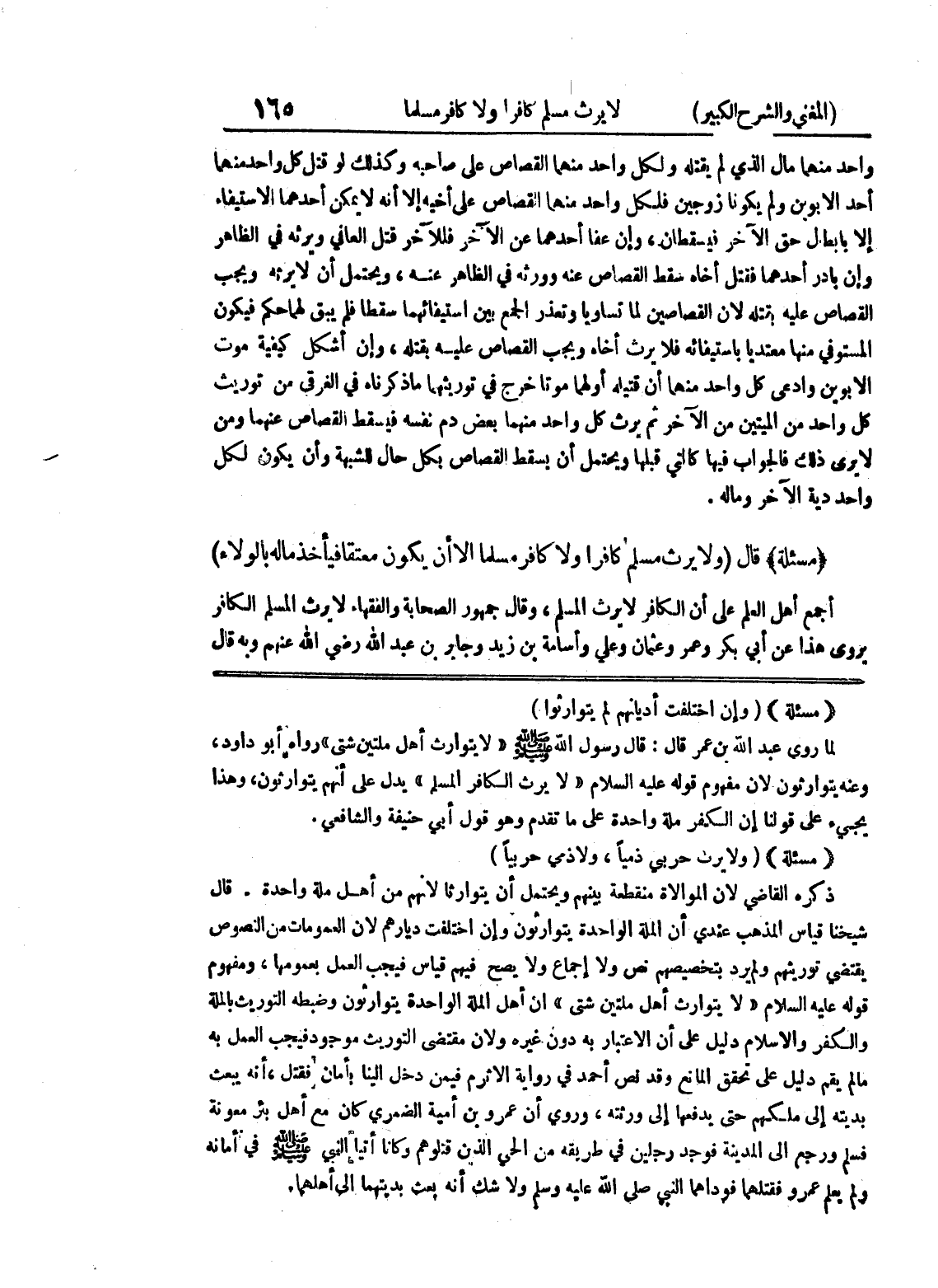 (مسألة) (ولا يرث حربي ذمياً، ولا ذمي حربياً) ذكره القاضي لأن الموالاة منقطعة بينهم ويحتمل أن يتوارثا لأنهم من أهل ملة واحدة.