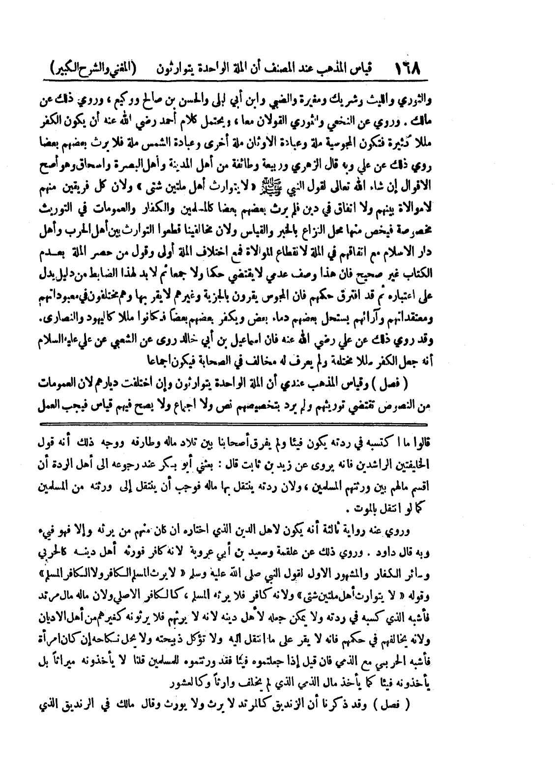 ولأنه يخالفهم في حكمهم فإنه لا يقر على ما انتقل إليه ولا تؤكل ذبيحته ولا يحل نكاحه إن كان امرأة فأشبه الحربي مع الذمي فإن قيل إذا جعلتموه فيئا فقد ورثتموه للمسلمين قلنا لا يأخذونه ميراثاً بل يأخذونه فيئاً كما يأخذ مال الذمي الذي لم يخلف وارثاً وكالعشور (فصل) وقد ذكرنا أن الزنديق كالمرتد لا يرث ولا يورث وقال مالك في الزنديق الذي