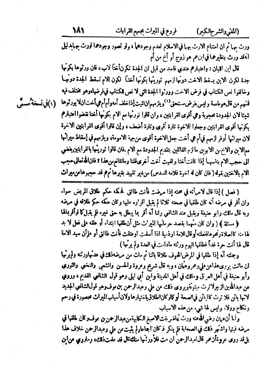 (فصل) إذا قال لامرأته في صحته إذا مرضت فأنت طالق فحكمه حكم طلاق المريض سواء وإن أقر في مرضه أنه كان طلقها في صحته ثلاثا لم يقبل إقراره عليها وكان حكمه حكم طلاقه في مرضه وبه قال مالك وابو حنيفة ويقبل عند الشافعي ولنا أنه أقر بما يبطل به حق غيره فلم يقبل كما لو أقر بمالها (مسألة) (وإن كان متهماً بقصد حرمانها الميراث مثل أن طلقها ابتداء أو علقه على فعل لابد لها منه كالصلاة ونحوها ففعلته أو قال للأمة أو ذمية إذا أسلمت أو عتقت فأنت طالق أو علم أن سيد الأمة قال لها أنت حرة غداً فطلقها اليوم ورثته مادامت في العدة ولم يرثها) وجملته أنه إذا طلقها في المرض المخوف طلاقاً بائناً ثم مات من مرضه ذلك في عدتها ورثته ولم يرثها إن ماتت يروى هذا عن علي وعمر وعثمان، وبه قال شريح وعروة والحسن والشعبي والنخعي والثوري وأبو حنيفة في أهل العراق ومالك في أهل المدينة وابن أبي ليلى وهو قول الشافعي القديم، وروي عن عبد الله بن الزبير لا ترث مبتوتة ويروى ذلك عن علي وعبد الرحمن بن عوف وهو قول الشافعي الجديد لأنها بائن فلا ترث كالبائن في الصحة أو كما لو كان الطلاق باختيارها ولأن أسباب الميراث محصورة في رحم ونكاح وولاء وليس لها شئ من هذه الأسباب ولنا أن عثمان رضي الله عنه ورث تماضر بنت الأصبغ الكلبية من عبد الرحمن بن عوف وكان طلقها في مرضه فبتها واشتهر ذلك في الصحابة فلم ينكر فكان إجماعاً ولم يثبت عن علي وعبد الرحمن خلاف هذا بل قد روى عروة أن عمر قال لعبد الرحمن ان مت فلاورثتها منك قال قد علمت ذلك، وما روي عن ابن