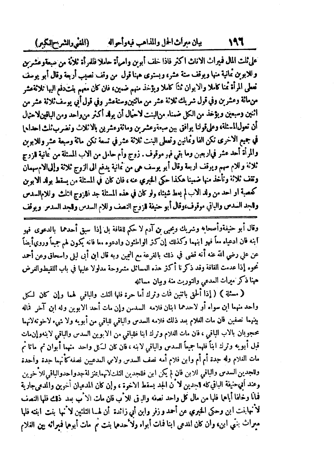 وقال أبو حنيفة وأصحابه وشريك ويحيى بن آدم لا حكم للقافة بل إذا سبق أحدهما بالدعوى فهو ابنه فإن ادعياه معاً فهو ابنهما وكذلك إن كثر الواطئون وادعوه معا فإنه يكون لهم جميعاً وروي أيضاً عن علي رضي الله عنه أنه قضى في ذلك بالقرعة مع اليمين وبه قال ابن أبي ليلى واسحاق وعن أحمد نحوه إذا عدمت القافة وقد ذكرنا أكثر هذه المسائل مشروحة مدلولا عليها في باب اللقيط والغرض ههنا ذكر ميراث المدعي والتوريث منه وبيان مسائله (مسألة) (إذا ألحق باثنين فمات وترك أما حرة فلها الثلث والباقي لهما وإن كان لكل