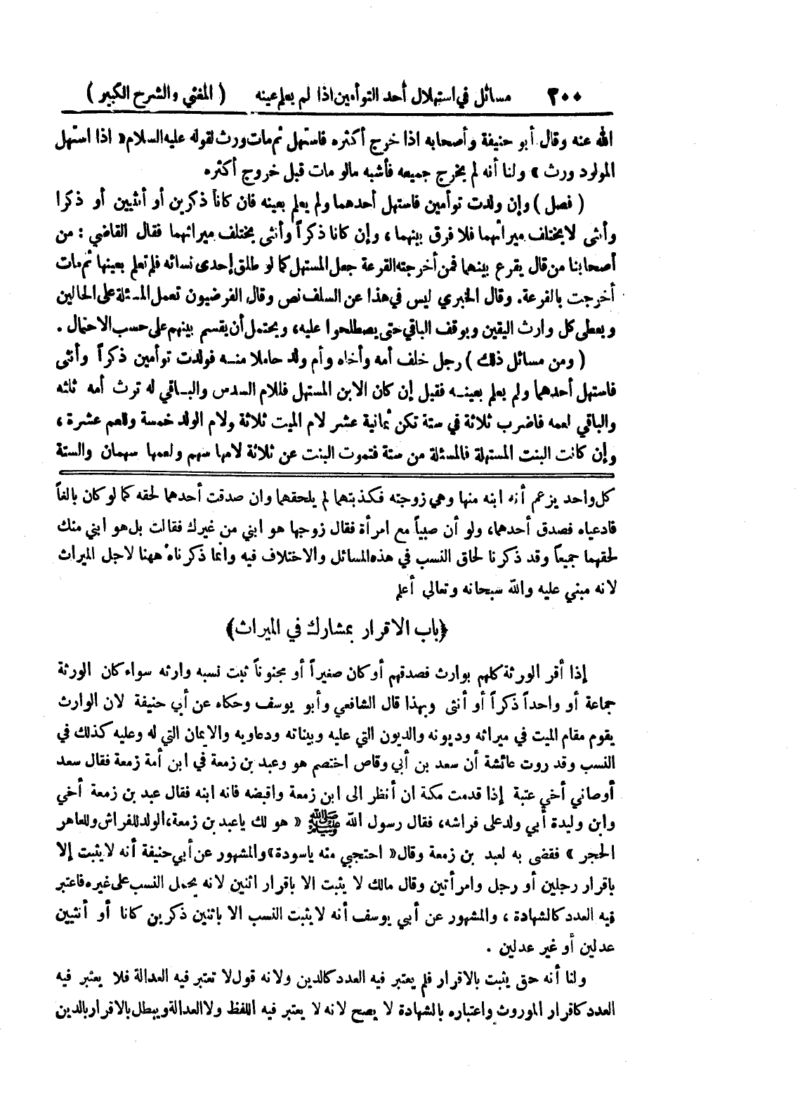 (باب الاقرار بمشارك في الميراث) إذا أقر الورثة كلهم بوارث فصدقهم أو كان صغيراً أو مجنوناً ثبت نسبه وإرثه سواء كان الورثة جماعة أو واحداً ذكرا أو انثى وبهذا قال الشافعي وأبو يوسف وحكاه عن أبي حنيفة لأن الوارث يقوم مقام الميت في ميراثه وديونه والديون التي عليه وبيناته ودعاويه والأيمان التي له وعليه كذلك في النسب وقد روت عائشة أن سعد بن أبي وقاص اختصم هو وعبد بن زمعة في ابن أمة زمعة فقال سعد أصاني أخي عتبة إذا قدمت مكة أن أنظر إلى ابن زمعة واقبضه فإنه ابنه فقال عبد بن زمعة أخي وابن وليدة أبي ولد على فراشه، فقال رسول الله صلى الله عليه وسلم " هو لك يا عبد بن زمعة، الولد للفراش وللعاهر الحجر " فقضى به لعبد بن زمعة وقال " احتجي منه يا سودة " والمشهور عن أبي حنيفة أنه لا يثبت إلا بإقرار رجلين أو رجل وامرأتين وقال مالك لا يثبت إلا بإقرار اثنين لأنه يحمل النسب على غيره فاعتبر فيه العدد كالشهادة، والمشهور عن أبي يوسف أنه لا يثبت النسب إلا بإثنين ذكرين كانا أو أنثيين عدلين أو غير عدلين.